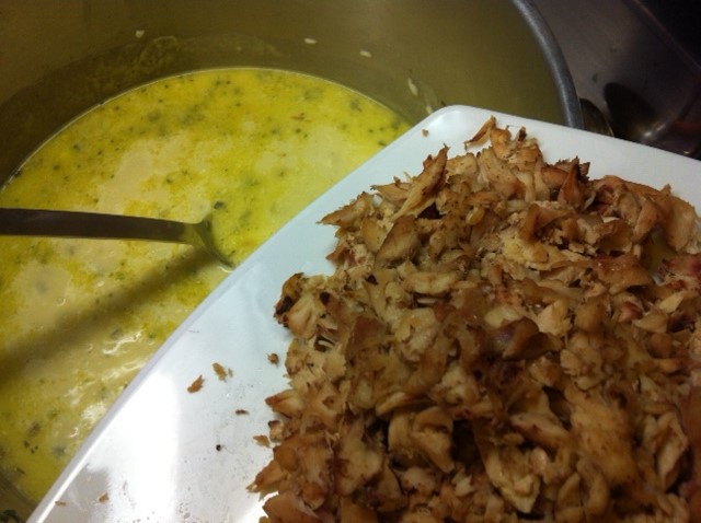 Mit Salz, Pfeffer und gemahlenem Ingwer würzen. Die Zesten einer Bio-Zitrone, Zitronensaft der ausgedrückten Zitrone und das Hühnchenklein dazugeben.