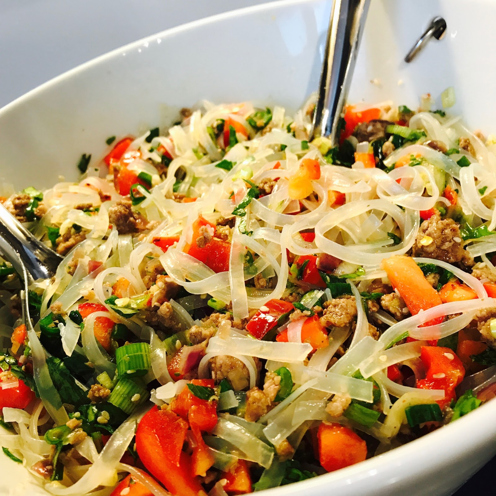 Frühlingszwiebeln dünn schneiden (ich mag keine rohen Zwiebeln, mir waren meine noch nicht dünn genug, ich würde sie beim nächsten mal kurz blanchieren, damit man nicht diesen extremen Zwiebelgeschmack im Mund hat, wenn man drauf beißt) und zu den Glasnudeln geben. Limettensaft, Fischsauce, Chilis, Blattpetersilie und Öl dazugeben. Das abgekühlte Hack mit in die Schüssel geben und gut verrühren. Beim Abschmecken habe ich mich nicht mehr an die Rezeptangaben gehalten, sondern mich auf mein Bauchgefühl verlassen. Aber als Anhaltspunkt war es schon super! Ich habe noch rote Paprika gehabt und die kleingewürfelt dazugegeben da mir der Salat sehr Nudellastig war. Auch grüne Paprika – die ich selten verwende – könnte ich mir hier gut vorstellen.