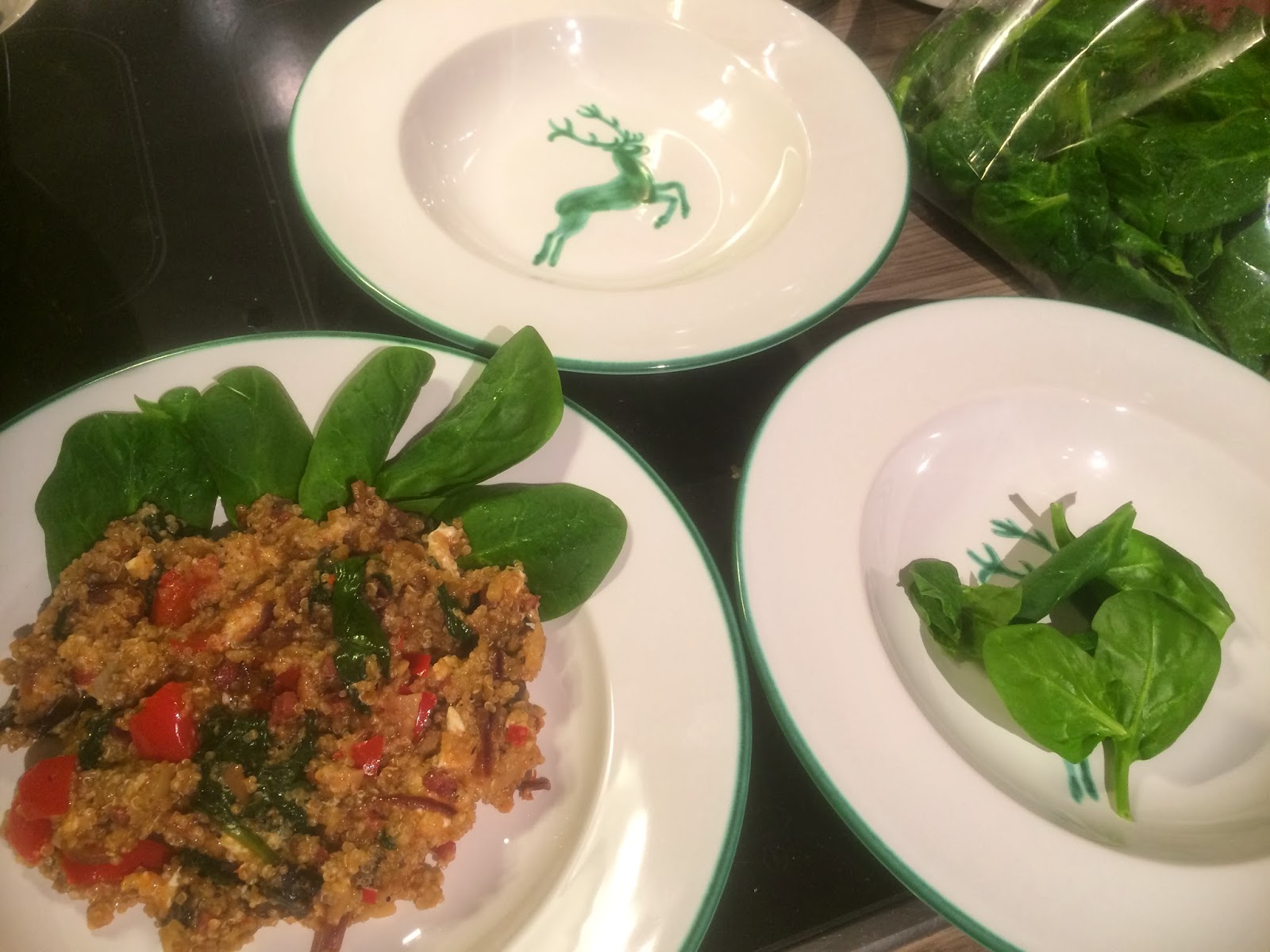 Dann sollte der Käse geschmolzen sein. Teller mit den verwahrten Spinatblättern ausgarnieren und die Quinoa-Pfanne servieren…