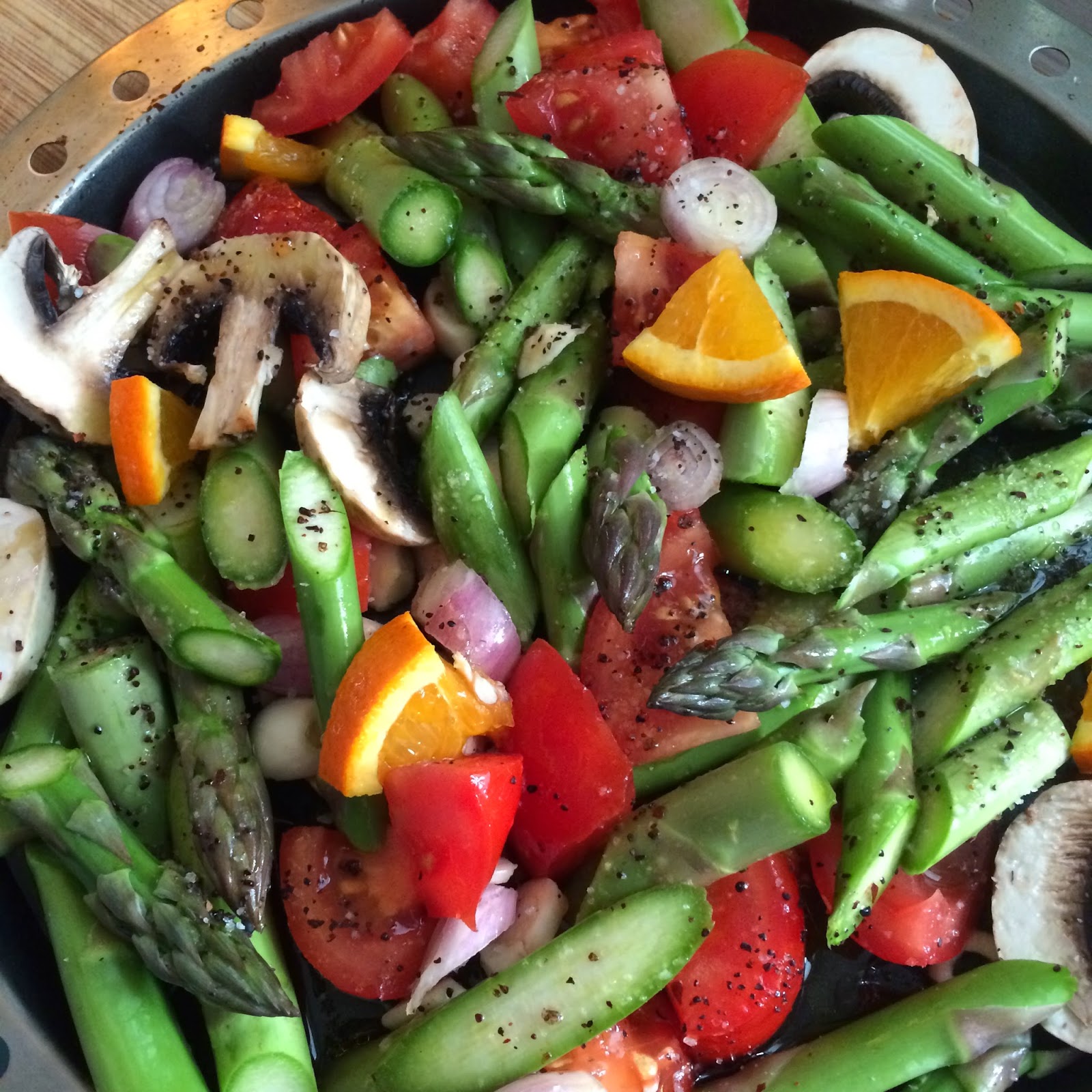 4 EL Orangenöl und den Saft einer halben Bio-Orange dazugeben, Luisenthaler Tiefensalz, schwarzer Pfeffer dazugeben. Die andere Hälfte der Bio-Orange erst in Scheiben und diese dann in Achtel schneiden, mit in die ofenfeste Pfanne geben und alles vermengen.