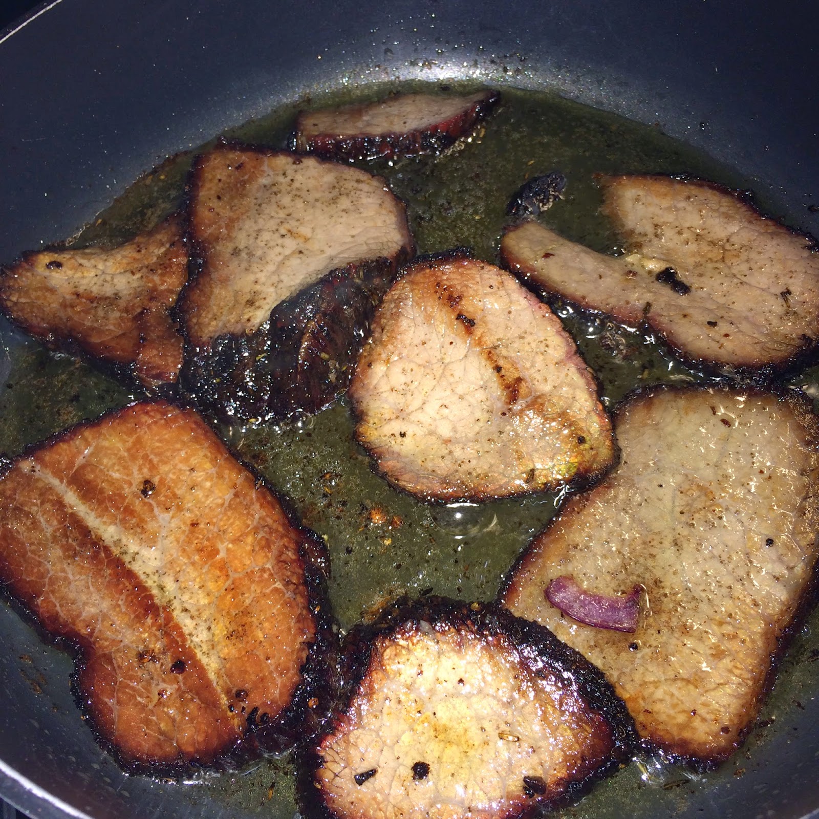 Ich habe mein 2 kg Stück marniert mit Rauchspecköl, Thymian, Rosmarin, Harissa und gestoßenem Koriander. Am nächsten Morgen ging es weiter: