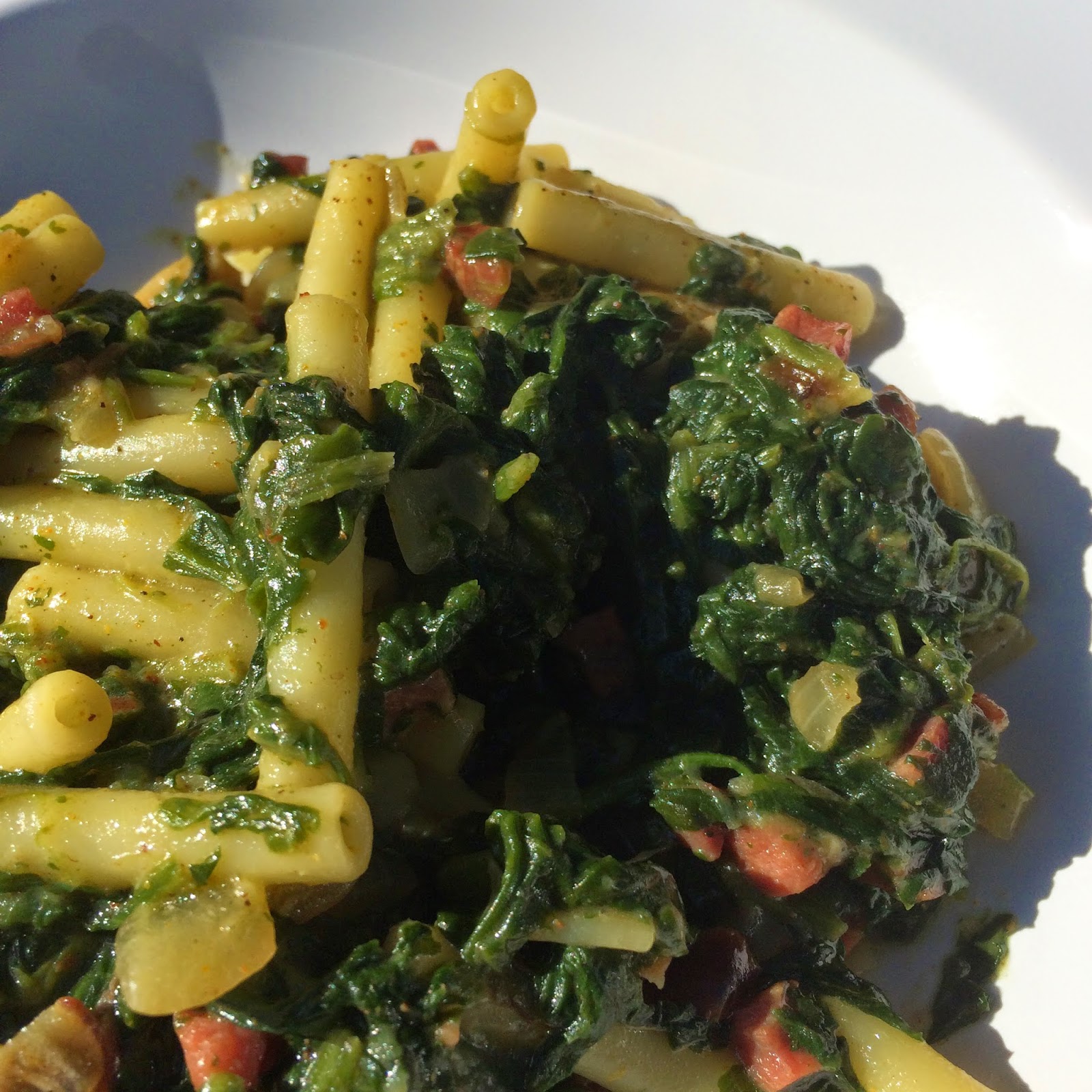 - Zwiebeln und Pilze in eine Pfanne mit Olivenöl geben, Blattspinat in die andere Pfanne