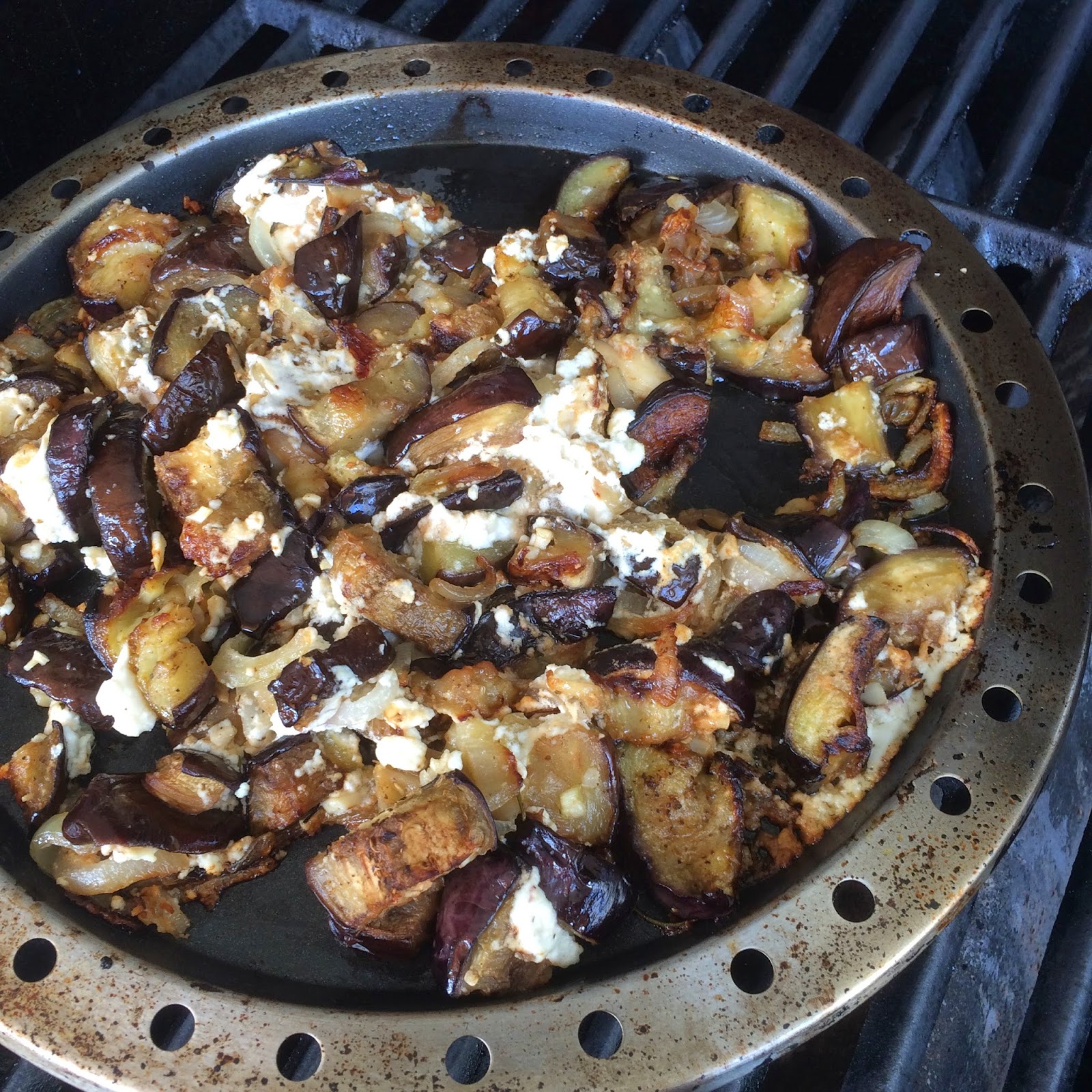 - Die kleingeschnittene Aubergine in die Form geben, diese auf direkte Hitze bei ca. 210°Grad stellen und den Deckel schließen