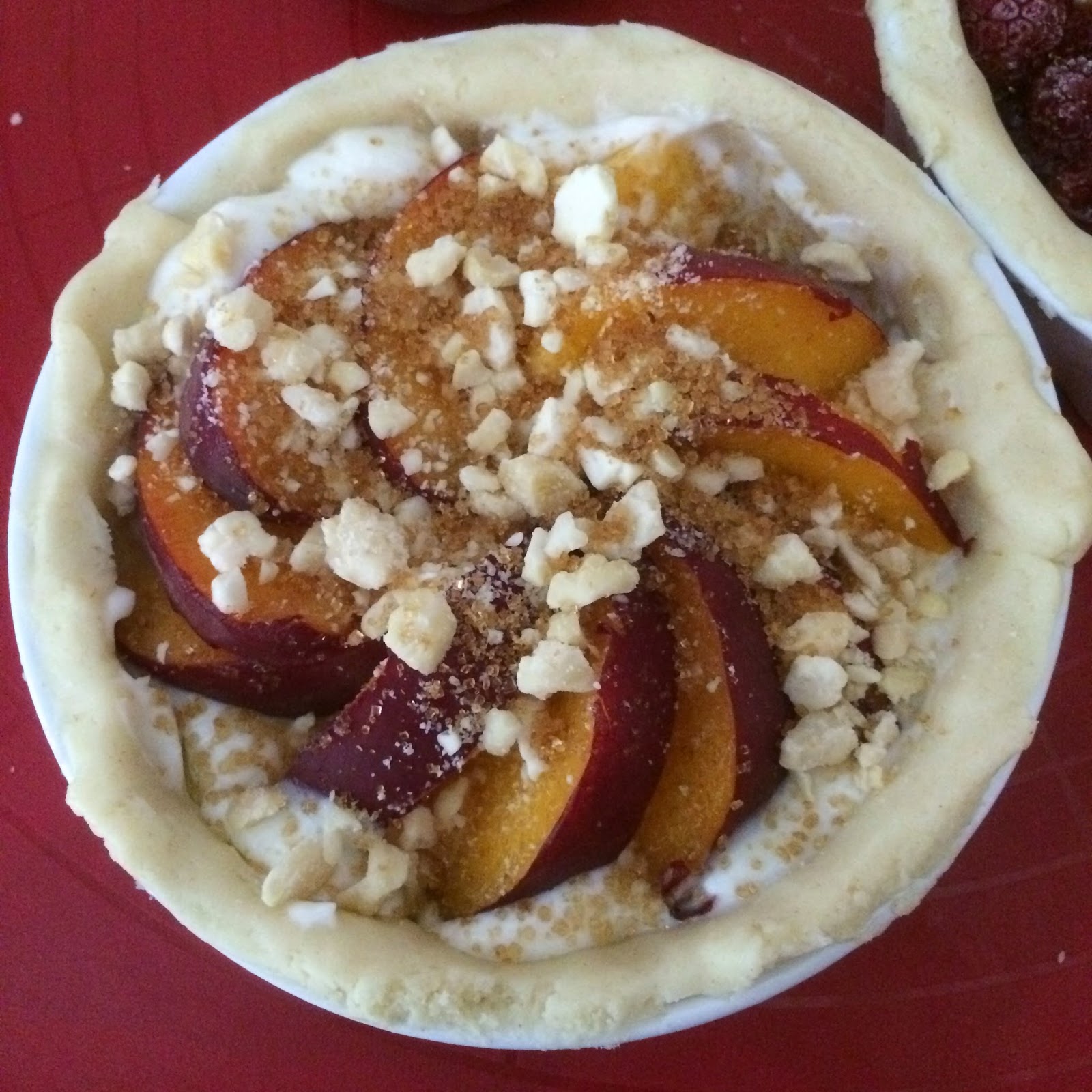 bei der süßen Tarte habe ich den Boden nun mit einem Gemisch aus Quark und Marmelade bestrichen und mit gemahlenen Mandeln bestreut. Dann habe ich die Pfirsiche reingesetzt und diese mit ein wenig Honig beträufelt, mit braunem Zucker und den restlichen gehackten Mandeln bestreut.