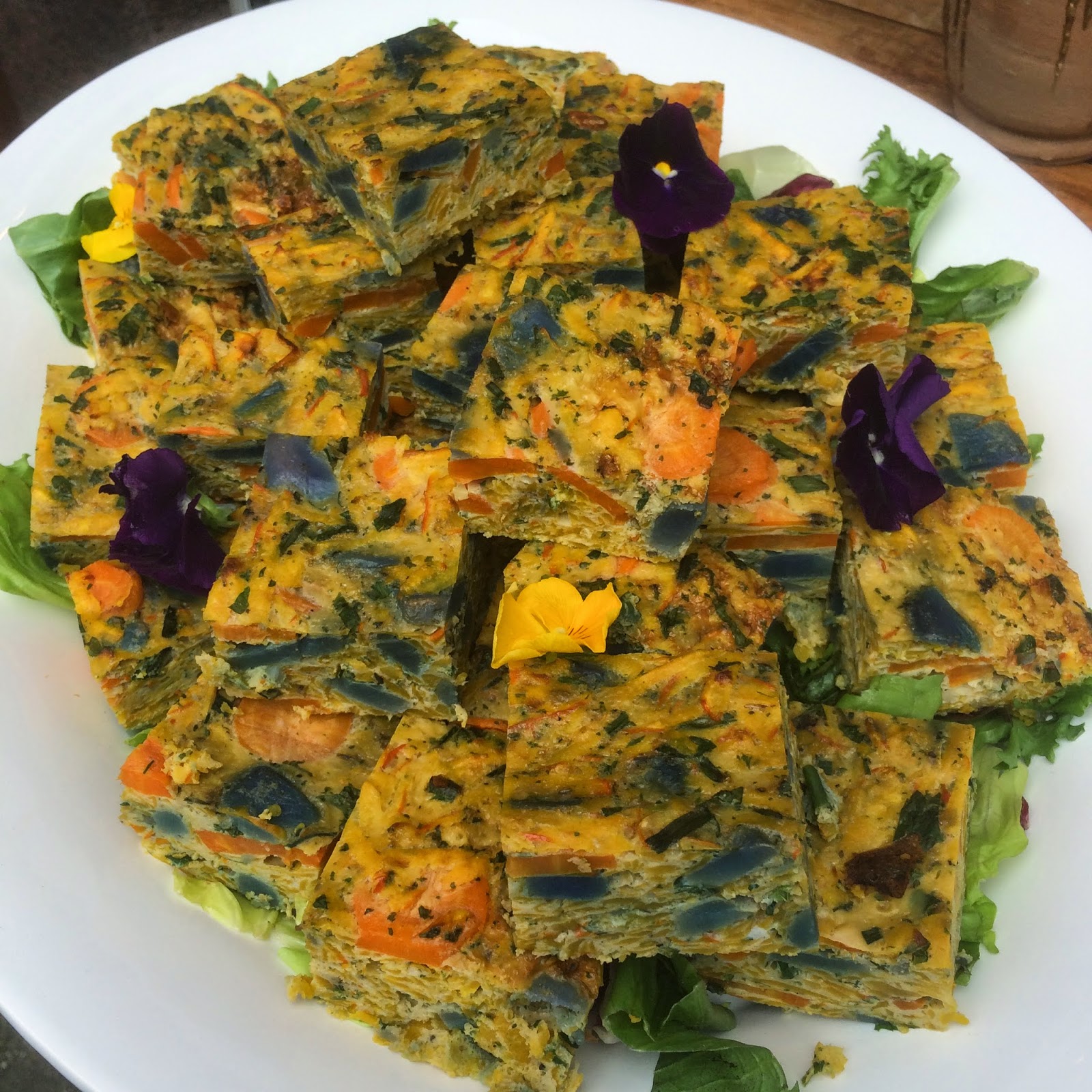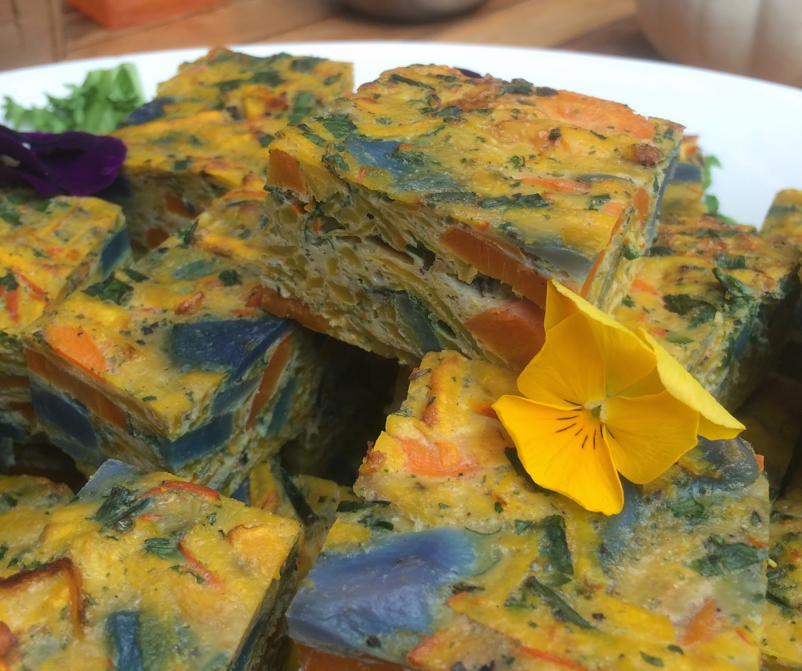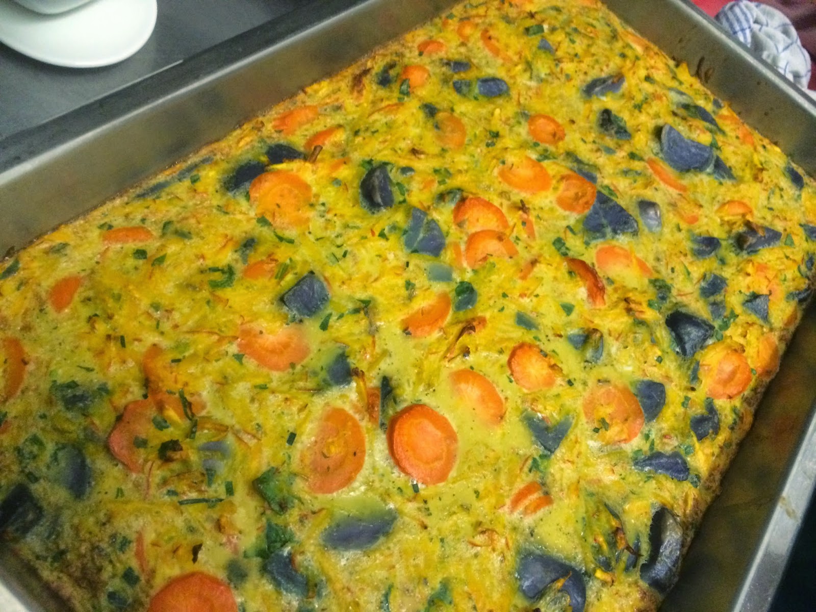Das Prinzip ist immer das Gleiche: Man nehme Gemüse nach Wahl, dünste das kurz an, schmeißt es in eine geölte Auflaufform und übergieße das ganze mit aufgeschlagenen Eiern. Die Eier werden natürlich gewürzt. Mit Salz und Pfeffer, oder aber mit Curry, Kräutersalz u.v.m…… Je nach Lust und Laune schmeiße ich auch mal Schinkenwürfel, Shrimps oder Käsewürfel mit dazu. Eine wunderbare Frittata ist die mit dem Blauen Schweden, eine lilafarbene Urkartoffel. Sie ist nicht nur schmackhaft sondern sind dazu noch ganz fantastisch aus: