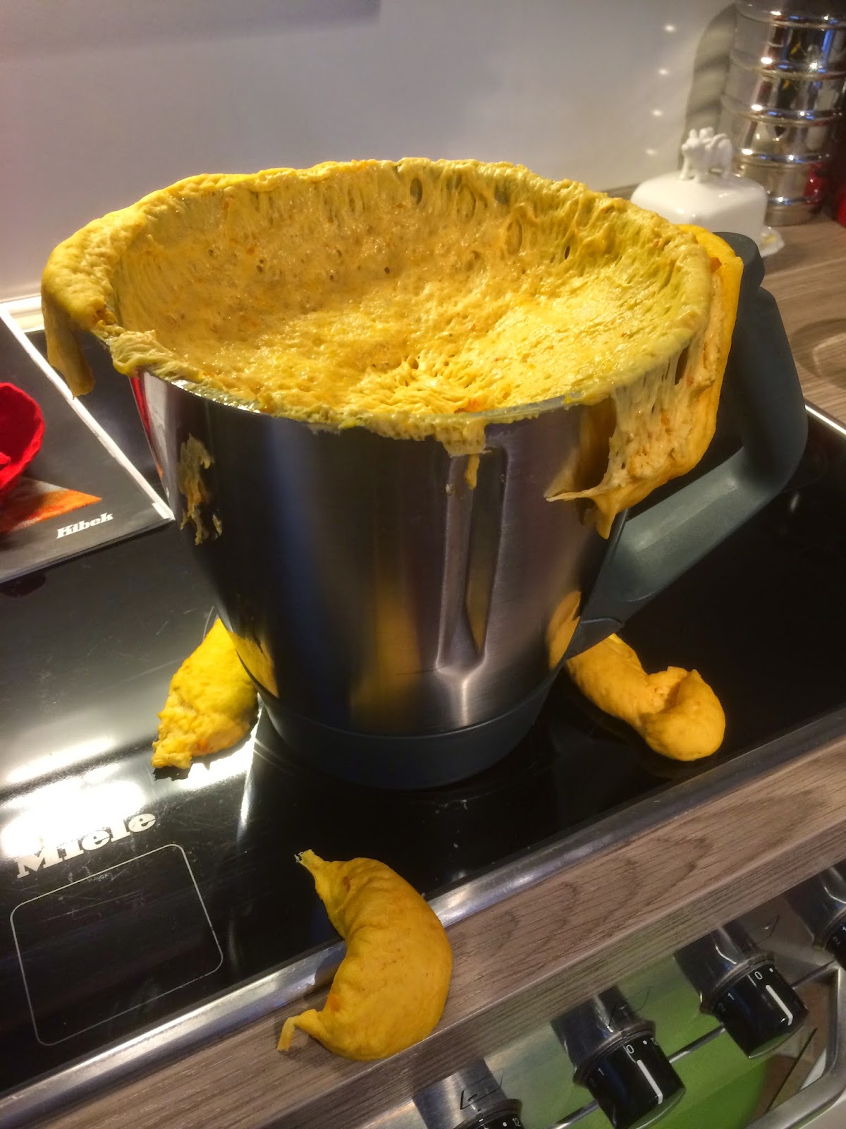 Das warme Kürbispüree, etwa 180 ml lauwarmes Wasser und 4 EL Öl dazugeben und mit dem Knethaken des Handmixers zu einem glatten Teig verkneten. Danach zugedeckt etwa 40 min. gehen lassen. Tipp: Geht an dieser Stelle nicht ins Kino. Sonst sieht es nach ca. 3 Stunden so aus, wenn ihr wieder kommt: