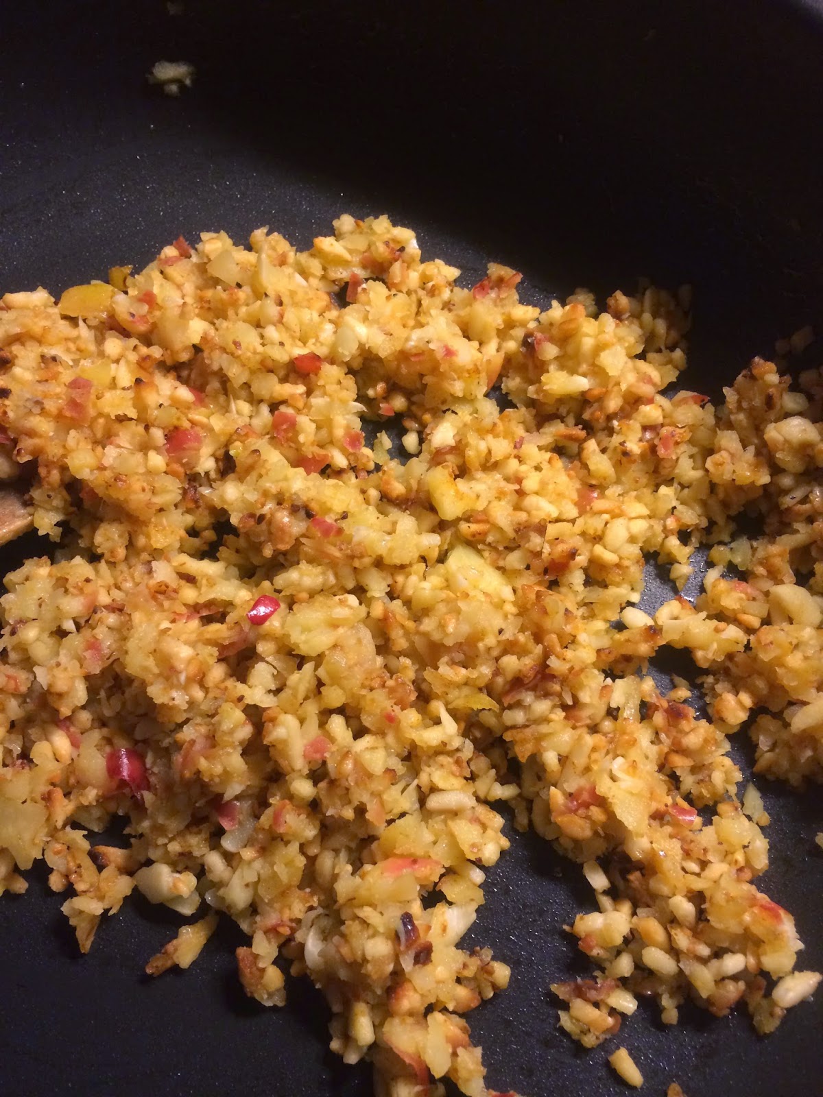 Mandeln, Apfel, Knobi und zurückgelegten Kürbis (oder Zucchini…) in der Küchenmaschine klein hacken. Alles in Olivenöl anrösten. Aufgießen mit Orangenöl (alternativ Olivenöl & Orangenzeste), abschmecken mit Piementon de la Vera & einem gutes Salz, evtl. noch einer Prise Chilli.
