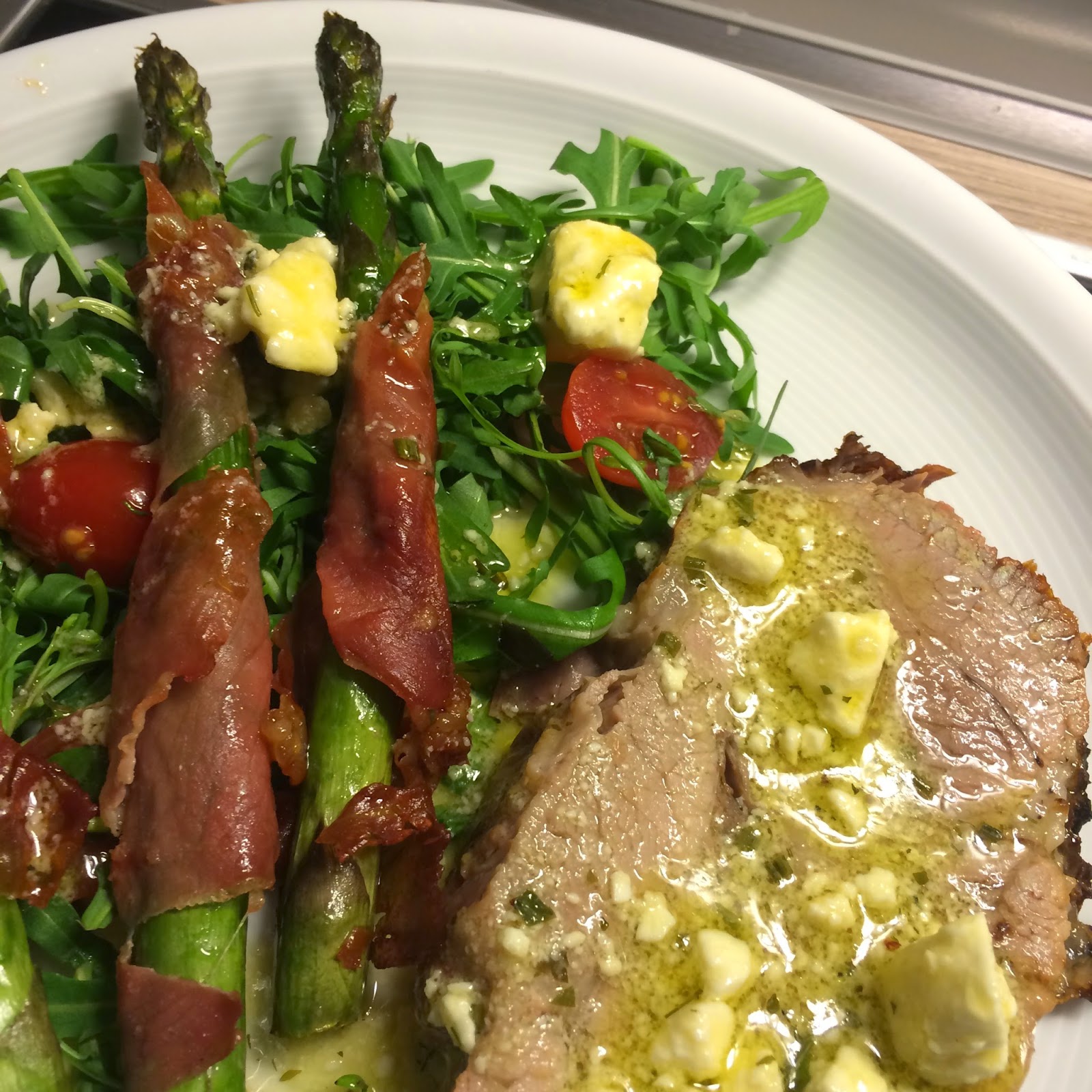 Bei uns gab es dazu grünen Spargel vom Grill und eine einfache Sauce aus kräftigem Olivenöl, Zitronensaft, Pfeffer und Schafskäse….