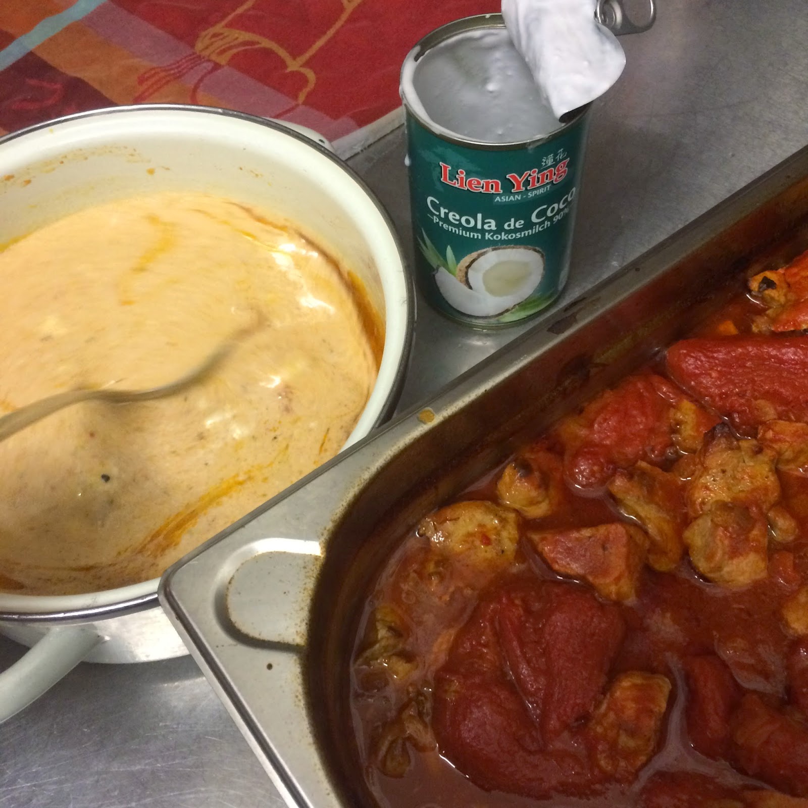 8 kg Schinkengulasch, 2500 Gramm geschälte Dosentomaten, grüne Currypaste, Fischsauce, 1 Kopf Chinakohl, ca. 1,5 kg Möhren, 6 Paprika rot, 6 mittlere Zwiebeln, 4 Dosen Kokosmilch (90%), Salz, Pfeffer, evtl. Limettensaft und wenn es seht scharf werden soll: Chili