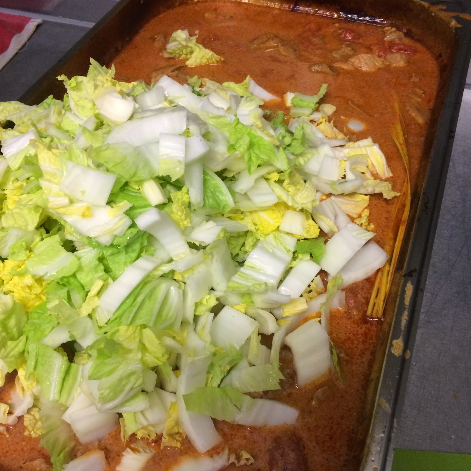 Die 4 Dosen Kokosmilch, 4 EL Currypaste, 1 EL Limettensaft, 1 EL Fischsauce dazugeben und alles gut vermengen. Den Sud aus dem Topf, sowie das Gemüse (Chinakohl, Paprika, Möhren) zu dem Gulasch geben und gut umrühren.
