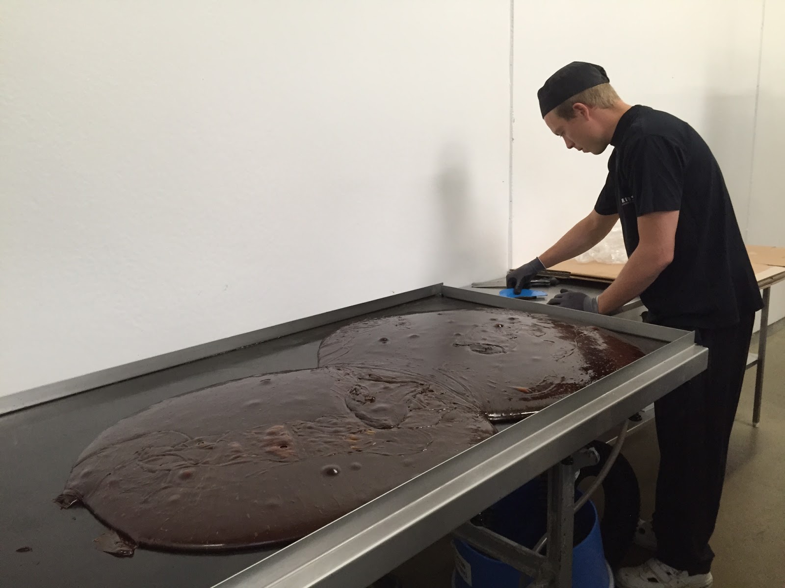 Die „Lakridsschlangen“ werden auf 16 Metern ausgerollt und anschließend geschnitten: