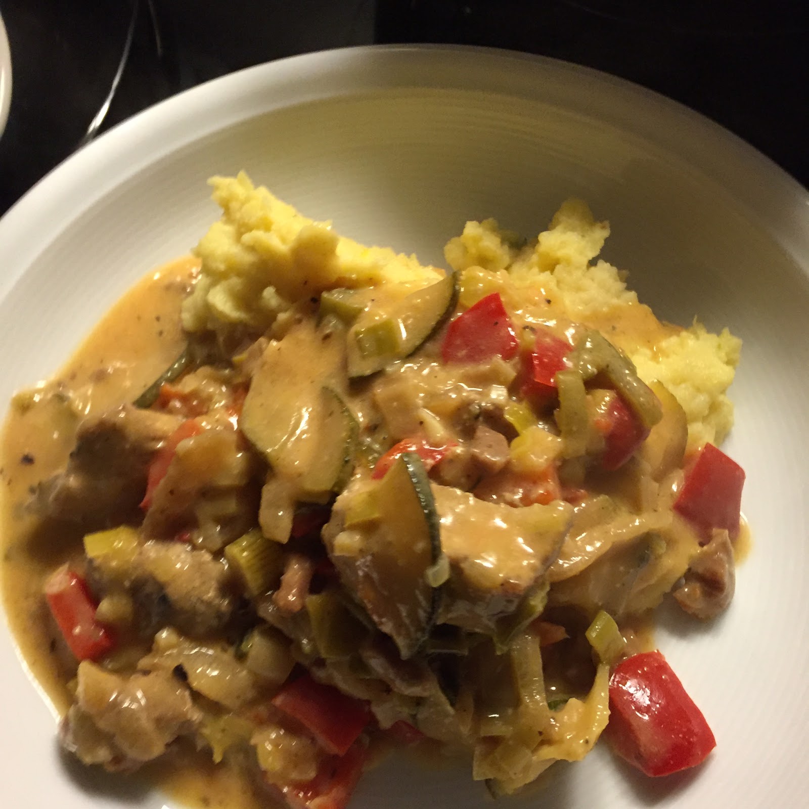 Das Püree in einen tiefen Teller geben und mit der Gemüse-Fleisch-Pfanne aufgießen. Und schnell mit dem Liebsten wieder auf die Couch. Einen schönen Film anschauen und einfach nur genießen….