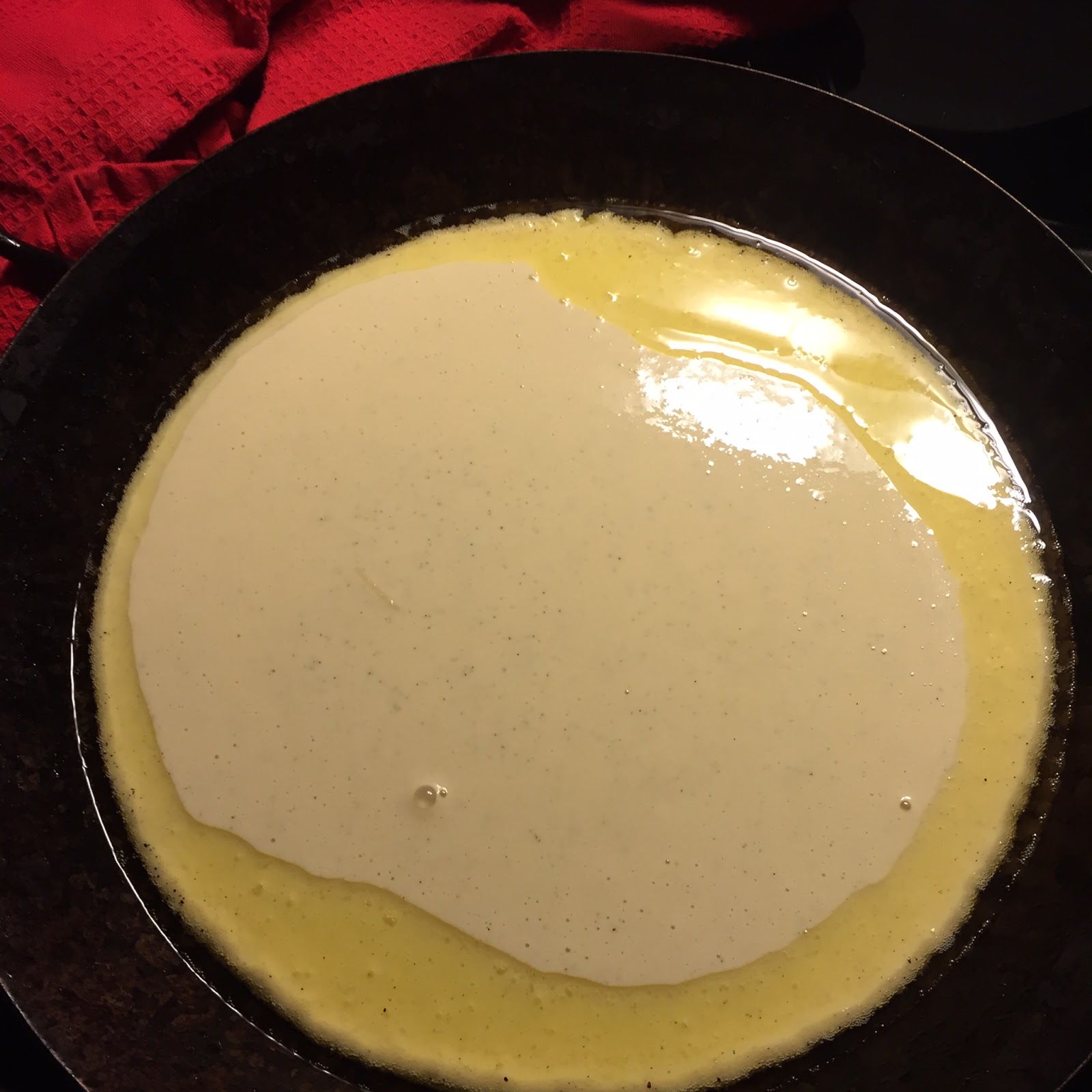 Die Pfanne aus dem Backofen nehmen ud einen EL Butterschmalz darin schmelzen lassen. Den Teig komplett hineingeben und sofort zurück in den Backofen stellen.