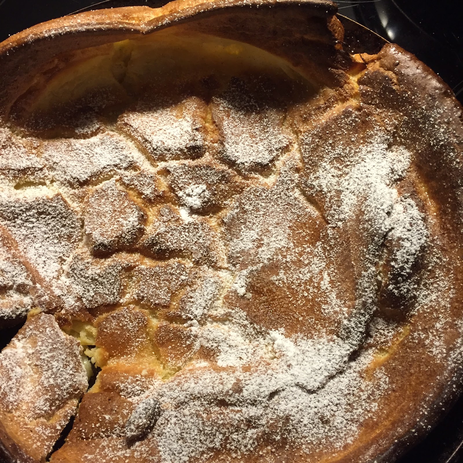 Für 20 Min. backen lassen. Herausnehmen und mit reichlich Puderzucker bestreuen. Je nach Geschmack mit Vanilleeis, Marmelade oder Kompott Eurer Wahl servieren.“