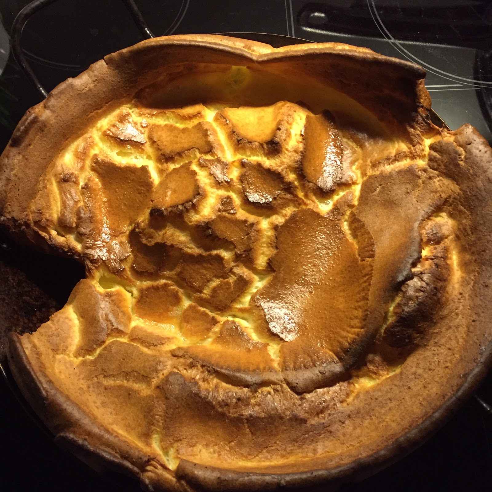 Vom Arbeitstag und den letzten Stunden – dem Show Down – aufgewühlt, liege ich dann auf der Couch: der Rücken und die Füße schmerzen, die Augen brennen, an den Händen meist ein paar Verbrennungen, aber ich bin glücklich! Und trotz aller Anstrengungen, dieses Gefühl ist unbezahlbar! Ich bin erst einmal glücklich, am nächsten Tag ausschlafen zu können, dann glücklich, weil mein Körper ruhen kann – alles tut weh – und ich bin stolz, es wieder geschafft zu haben! Nach tagelangen – oft wochenlangen Überlegungen, Verkostungen, schlaflosen Nächten, Kochbuchwälzen, habe ich es nach so einer Abendveranstaltung geschafft! Bäm! Egal welchen Whisky mein Mann bringt – ich mache ein Essen dazu! Ein ehrlicher Gin – die Küche pariert mit reinen Speisen! Sherry-Fass, Torf, Wacholder, Olive…. die Küche wirft immer eine Karte mit in den Ring! Das ist aufreibend! Spannend! Anstrengend! Und wenn es paßt, ein Gefühl wie ein gewonnenes Derby! Ich bin glücklich, weil ich Erlebnisse erfinden darf, ich schicke meine Gäste auf Geschmacksreisen. Und ich bin so wahnsinnig glücklich und auch dankbar, wenn das Harmoniespiel gelingt, dass das wie eine Droge für mich ist. Aber – davon wollte ich gar nicht reden. Es geht eher um die Stunden danach! Ich bin beseelt, glücklich, dankbar und k.o. Und trotzdem schlaflos! Zuviel Adrenalin fließt durch die Adern! Mit was beschäftige ich mich wohl in solchen Situationen während mein Hund auf meinen Füßen schläft? Ganz klar: mit dem Essen am nächsten Tag! Also liege ich mit körperlichen Schmerzen aber innerlich besseelt auf der Couch und google nach schönen Sonntags-Rezepten, schaue bei meinen Lieblingsblogs vorbei und überlege, was ich in den nächsten 24 Stunden neu kochen könnte! Es darf nicht ganz ausgefallen sein, meistens ist der Kühlschrank zu Hause eher leer. Aber als ich dieses Rezept von Steph, der Blogerin des absolut tollen und empfehlenswertem Foodblogs „Kleinen Kuriositätenladen“ las, wußte ich sofort: ich habe nicht nur alle Zutaten zusammen, sondern es ist auch ein sehr schönes und doch einfaches Rezept, welches ich ohne viel Arbeit umsetzen kann! Ideal nach zubacken – auch schaffbar mit müden Knochen und kleiner Vorratskammer! Ideal für meine süß-liebenden Leckerschmecker Familienmitglieder! Der Ofenpfannkuchen schmeckt himmlisch! Er ist wenig arbeitsintensiv, so dass man ihn gut zum ausgedehnten Frühstück backen kann oder man rührt ihn schnell zusammen und verzehrt ihn mit der Familie Nachmittags bei einer gemeinsamen Spielerunde!