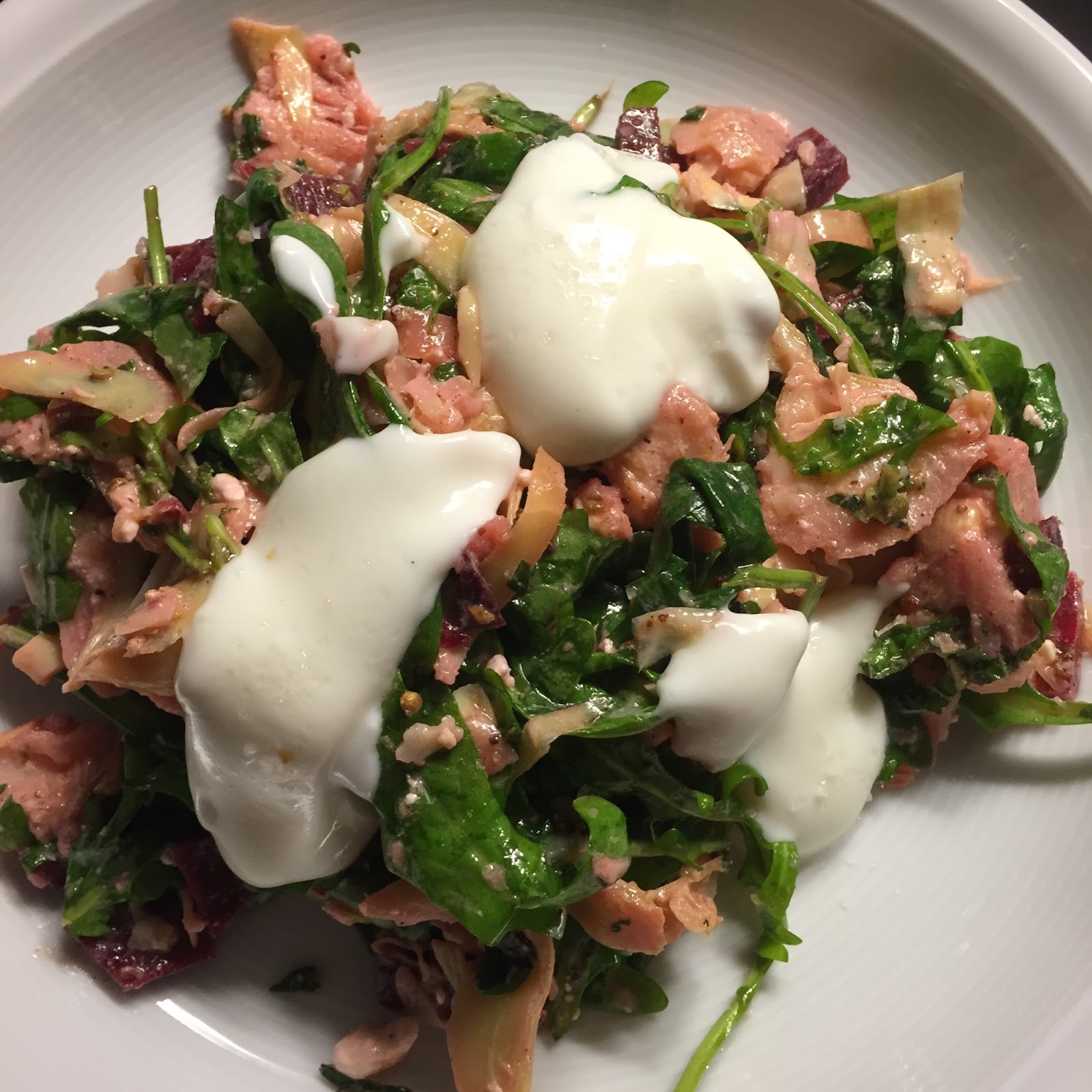 Den Jogurt mit 1 kleinen EL Olivenöl, ein wenig Zitronensaft, 1 Prise Maldon Sea Salt, 1 Prise Sumach verrühren.