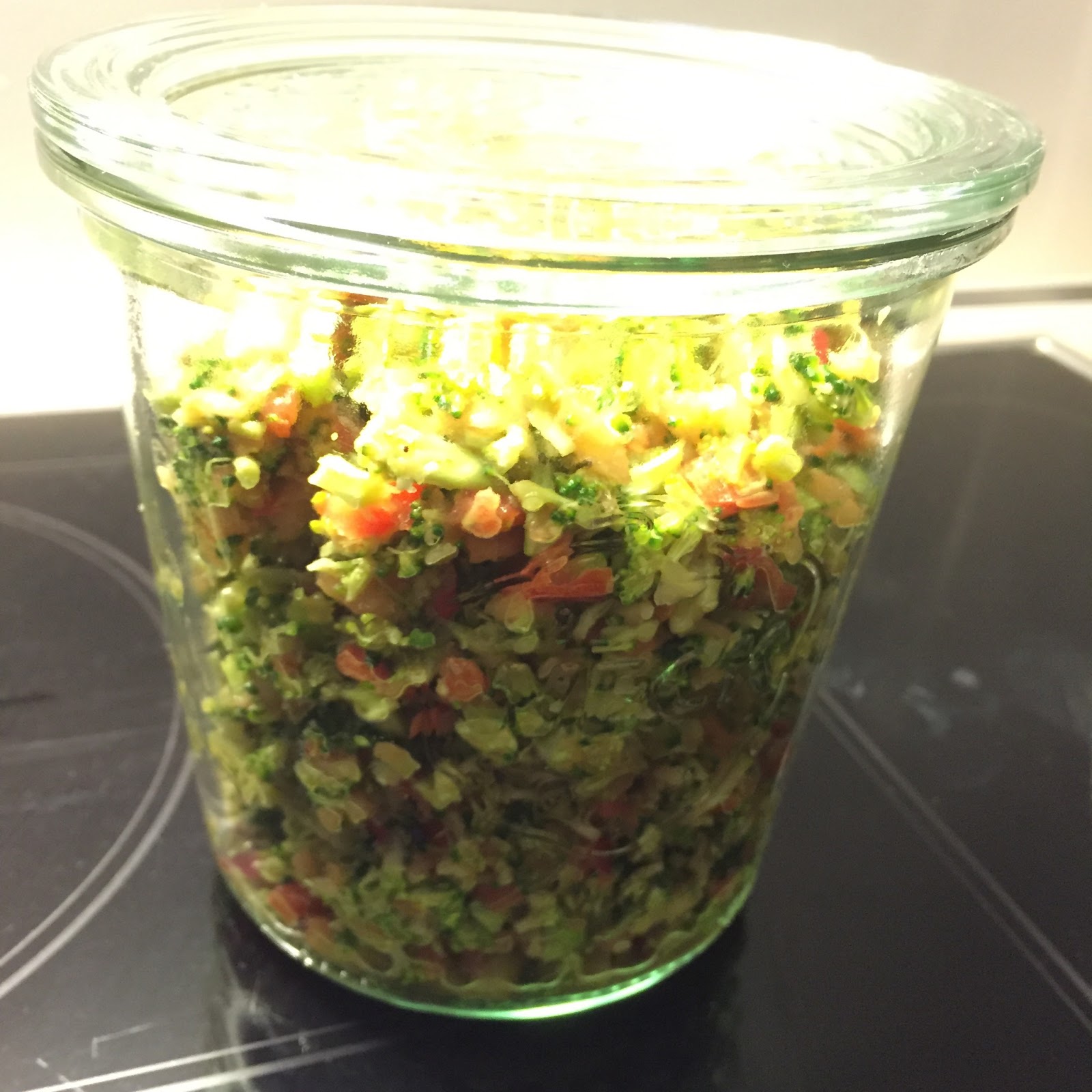 Das Gemüse und den Apfel waschen. Vom Brokkoli die Röschen abmachen und in Thermomix geben. Die Paprika und den Apfel entkernen, vierteln und ebenfalls mit allen anderen Zutaten in den Mixbehälter geben. Bei 4 Sekunden Stufe 4-5 zerkleinern. Alles mit dem Spatel nochmals gut durchühren und bei Bedarf nochmals 1-2 Sekunden feiner mixen. In ein Glas oder eine Schüssel füllen und servieren….