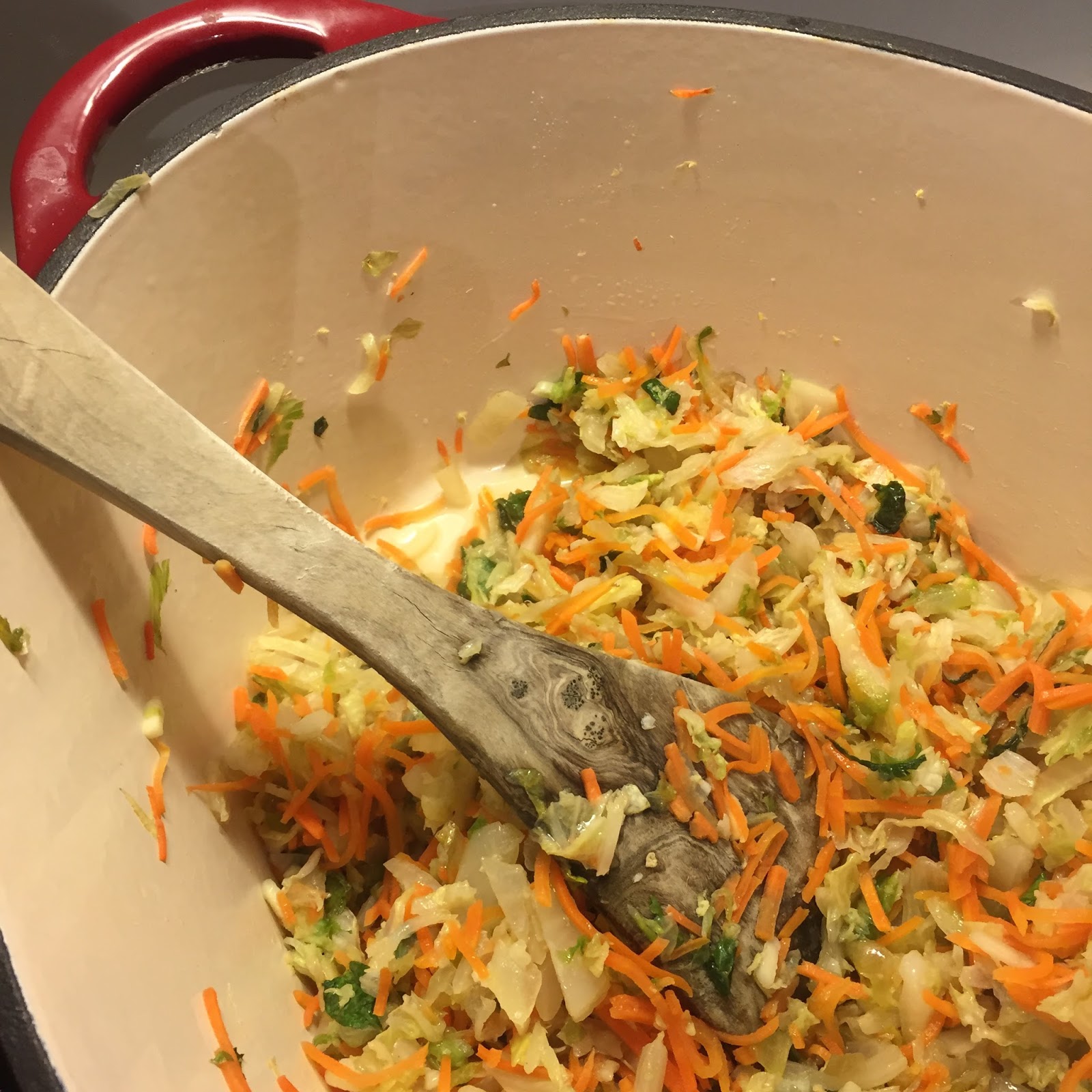 Den Kohl säubern und in feine Streifen schneiden. Die Möhren hobeln und in feine Scheiben schneiden oder mit der Küchenmaschine in feine Streifen hobeln. Beides in einem vorgewärmten Bräter mit Olivenöl andünsten. Den Knobi zerkleinern und den Ingwer reiben. Beides mit in den Bräter geben und alles 10-15 Minuten mit 3-4 Prisen gutem Küchensalz andünsten. Immer wieder umrühren. Die Cashew-Kerne mit dazugeben und gut verrühren – mit dem Tombinambur sorgen sie für eine schöne Haptik und „Knackigkeit“ in der Speise!