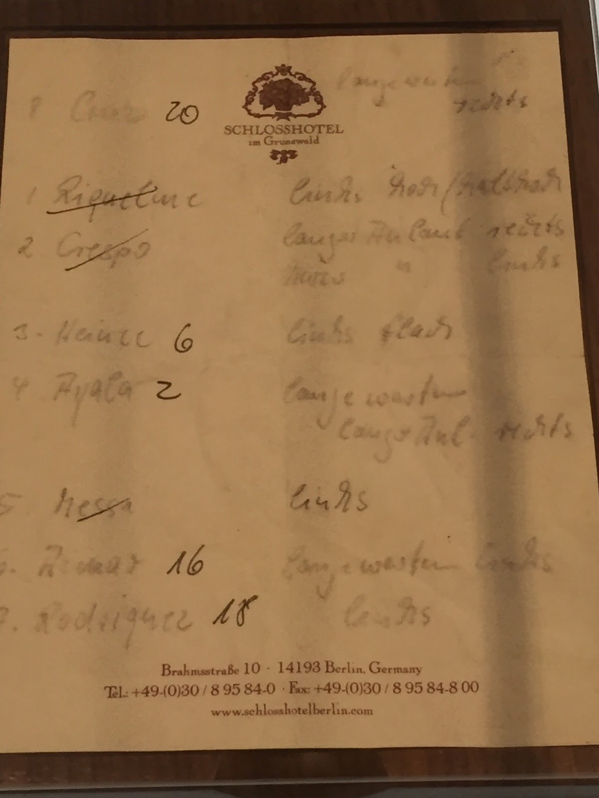 Nachdem man in der 1. Etage Lehmanns ominösen Zettel bewundert (ich weiß jetzt, was tatsächlich draufstand – Spoileralarm: am Ende des Textes habe ich den Zettel (fast unkenntlich gemacht) für Euch abgebildet), auf Original-Bänken die Highlights aus über 100 Jahren Fußallgeschichte gesehen und das ein oder andere Geheimniss aus Kabinen, Hotelzimmern und Tagebüchern erfahren hat, kann man gut in das Restaurant (am Ende der 1. Etage) einkehren und zu angemessenen Preisen nette Kleinigkeiten essen und guten Wein oder ein kühles Bier geniessen.