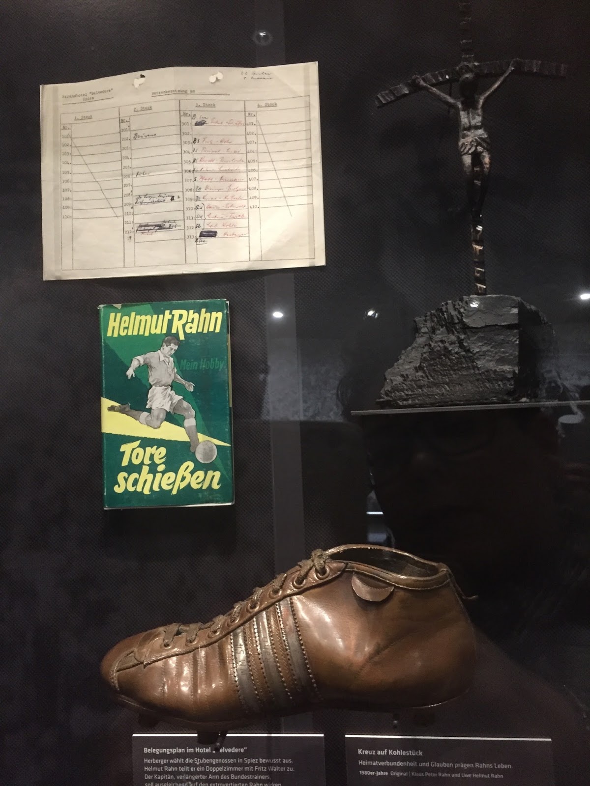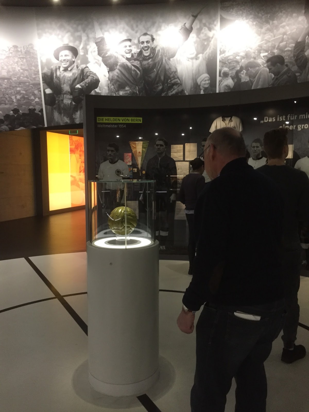 Das Deutsche Fußballmuseum ist ein Selbstentdecker-Haus und so konzipiert, dass jeder Besucher eigenständig losziehen kann, um die Themen und Ereignisse aus über 150 Jahren Fußballgeschichte zu entdecken, die ihn besonders interessieren. Während Papa ehrfürchtig vor „dem“ Lederball stehen blieb und die Lebensläufe der Mannschaftsmitglieder studierte, schaute ich mit Evi die Originalübertragung im Originalgetreuen 50’er-Jahre – TV („Mama, was ist das?„) und wartete auf die berühmten Radiomoderatoren-Worte: „Und Rahn schießt….“.