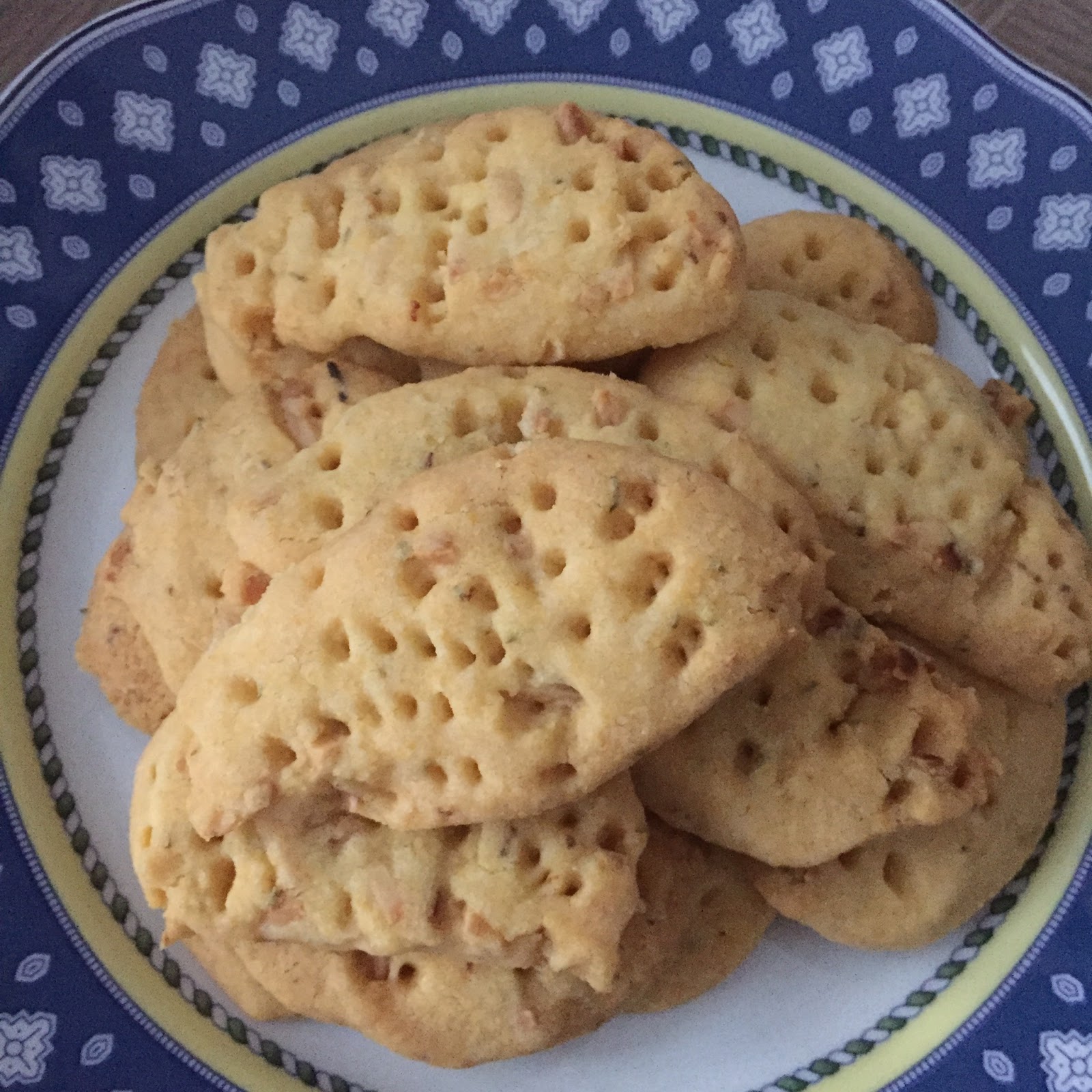 25 gr Pinienkerne, 150 gr weiche Butter, 25 gr Zucker, 150 gr Mehl, 75 gr Polenta (mittelfein), 1/4 TL Meersalz, 1 EL Olivenöl, 1 Handvoll frische Kräuter (ich: gehacktes Rosmarin), (die Autorin mag am liebsten Estragon, Kerbel und Zitronenthymian), fein geriebene Schale einer halben, unbehandelten Zitrone