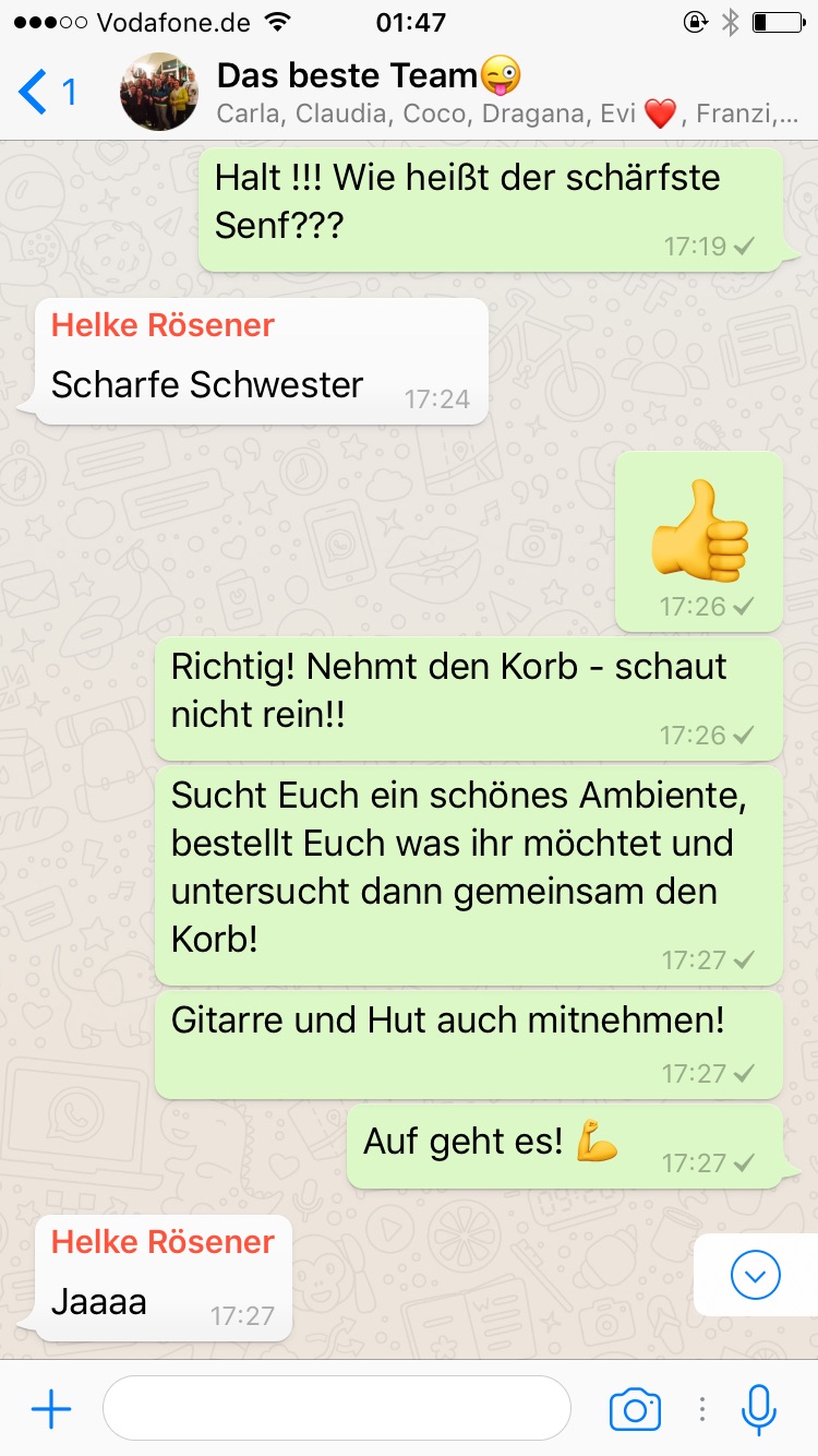 Gelüftet haben wir dieses erst mit dem Zettel, den wir ganz unten in dem erspielten Korb versteckt haben: „Mittels Hut und Gitarre draußen vor dem Ambiente sei so lange zu singen, bis sie gemeinsam als „Band“ mindestens 3,- € erspielt haben! Mittels der Einnahmen können sie sich dann auslösen…“