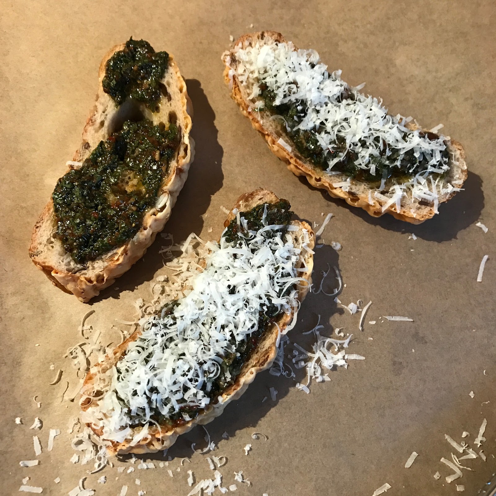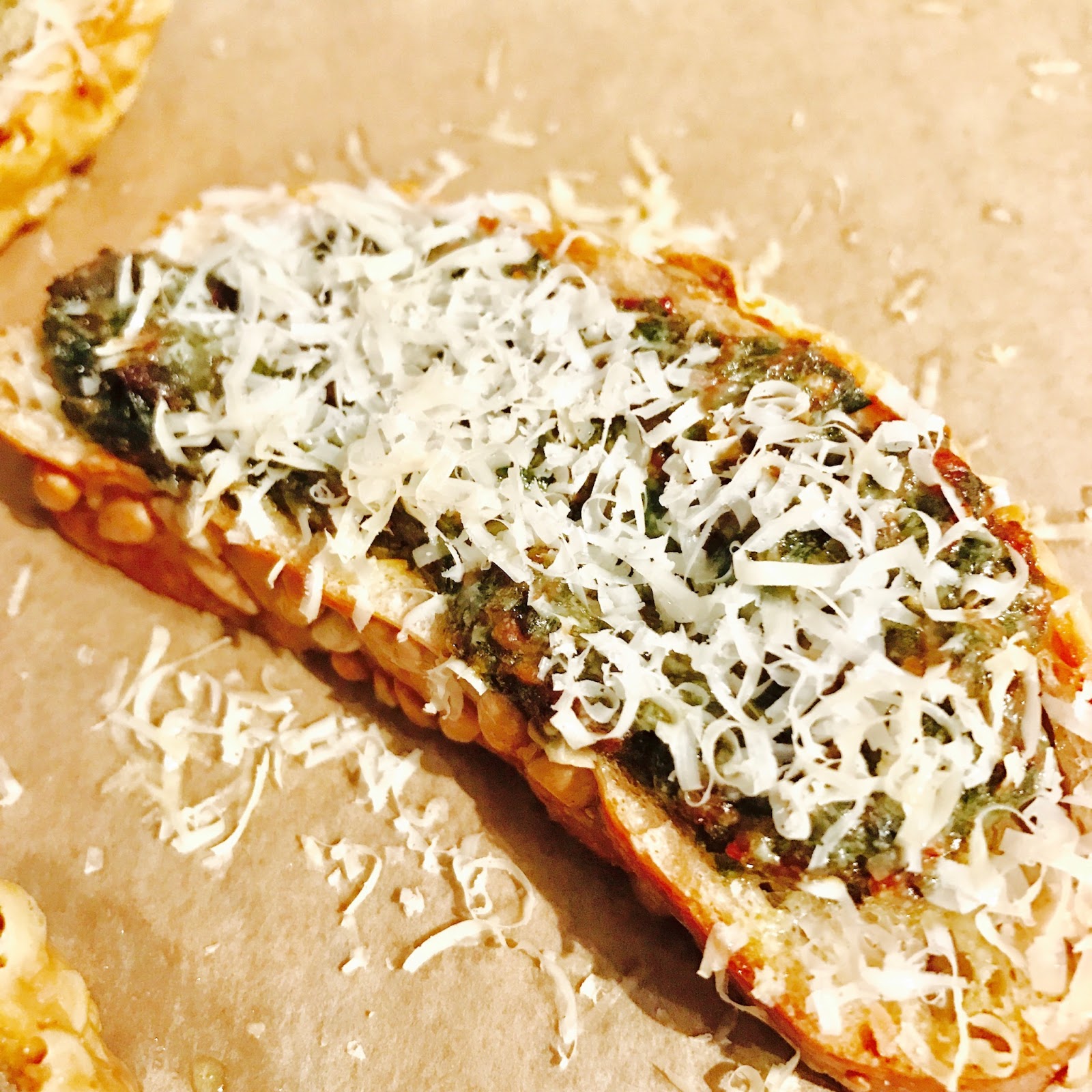 Nach 5 Minuten die Scheiben wenden. Nach weiteren 5 Minuten (ich mag es cross!) das Blech rausheben und die Scheiben mit dem Pesto ca. 0,5 cm dick „bestreichen“ – funktioniert am bestem mit einem Teelöffel. Nun mit einer feinen Reibe Parmesan über die Scheiben reiben und das Blech noch einmal für ca. 3-5 Minuten in den Ofen geben.