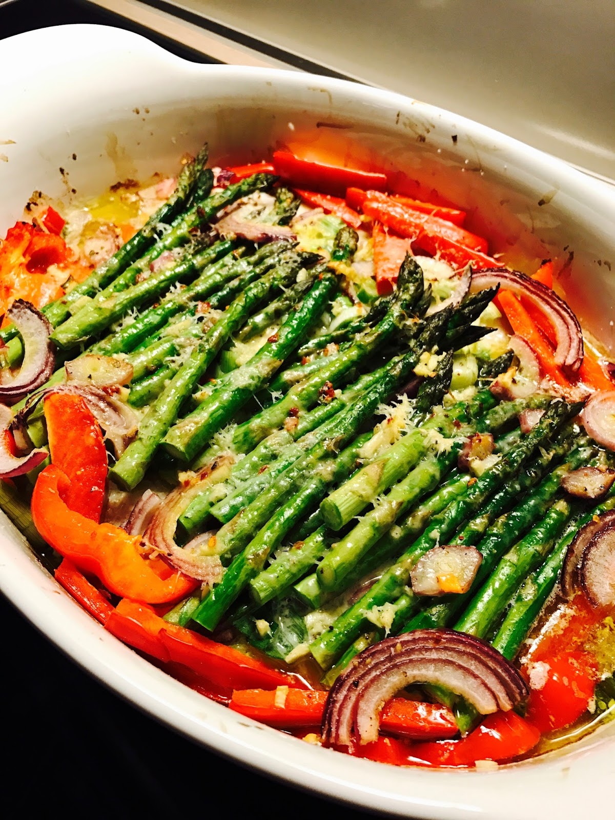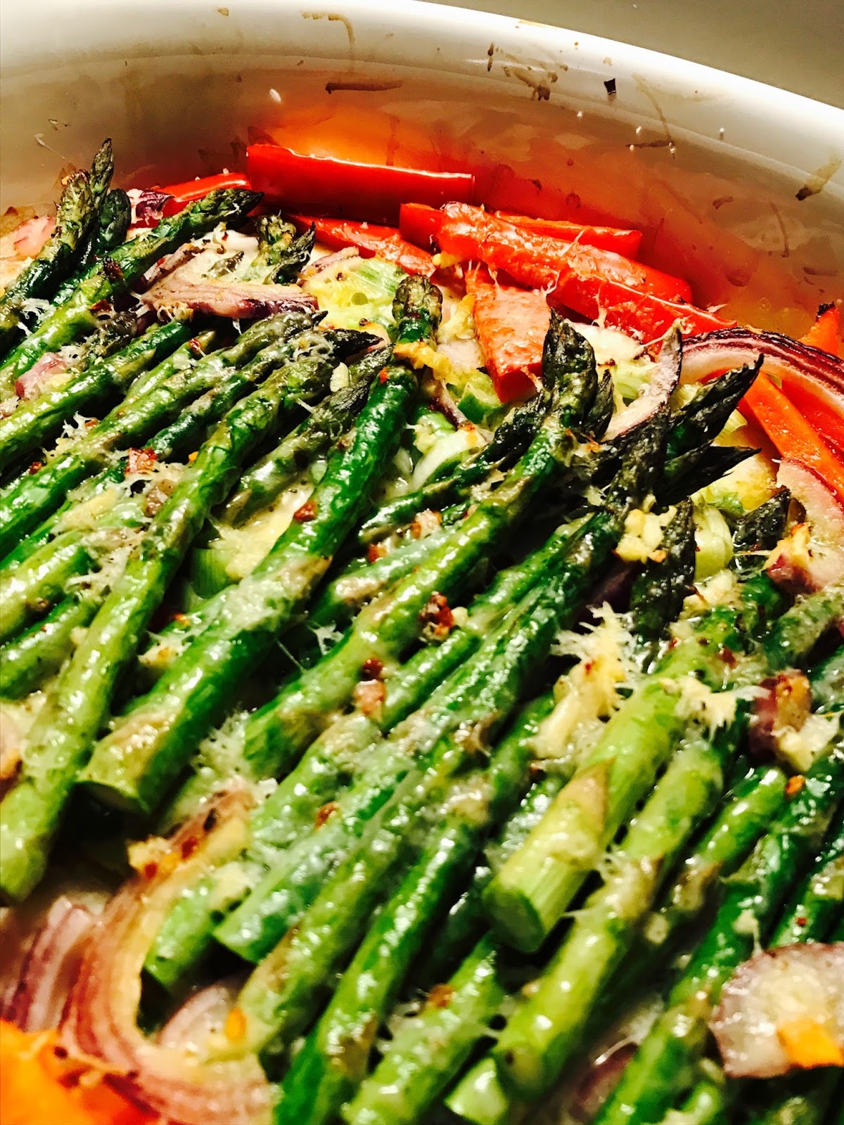 Die roten Paprika kam eigentlich nur dazu, da Evi keinen Spargel mag! Sie passen jedoch nicht nur optisch, sondern auch geschmacklich sehr gut! |