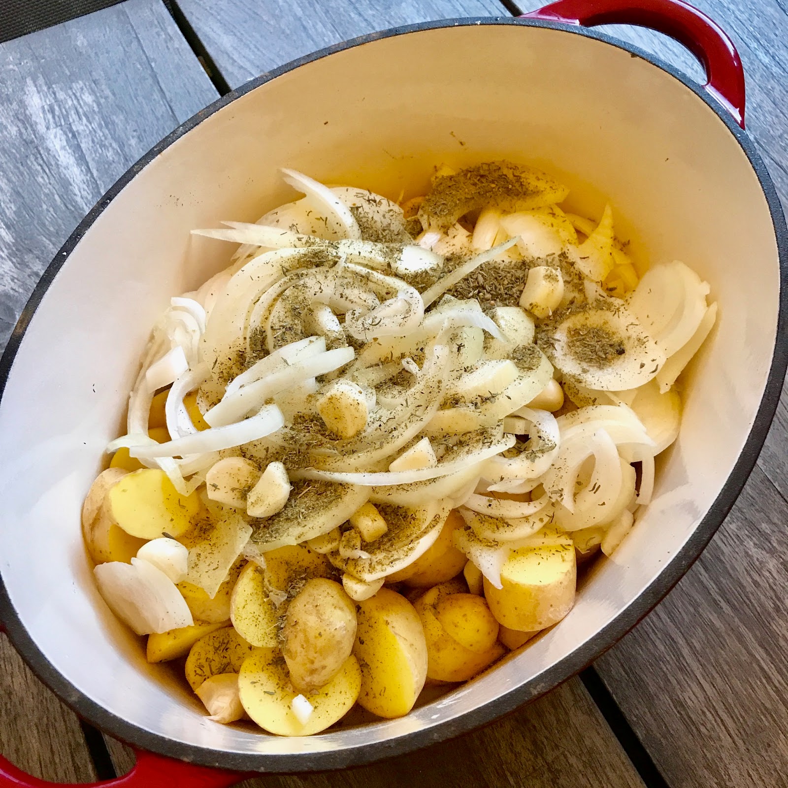 Die Kartoffeln waschen und in mundgerechte Stücke schneiden. Die Zwiebeln in halbe Ringe, den Knoblauch in feine Scheiben schneiden. Alles in einen feuerfesten Topf geben und 2 EL BBQ-Mischung obenauf geben. Den Deckel auf den Topf legen und den Topf bei indirekter Hitze und ca. 170°C unter den Grill oder in den Backofen geben. Kein Wasser dazugeben! Die Kartoffeln und Zwiebeln geben genug Wasser ab!