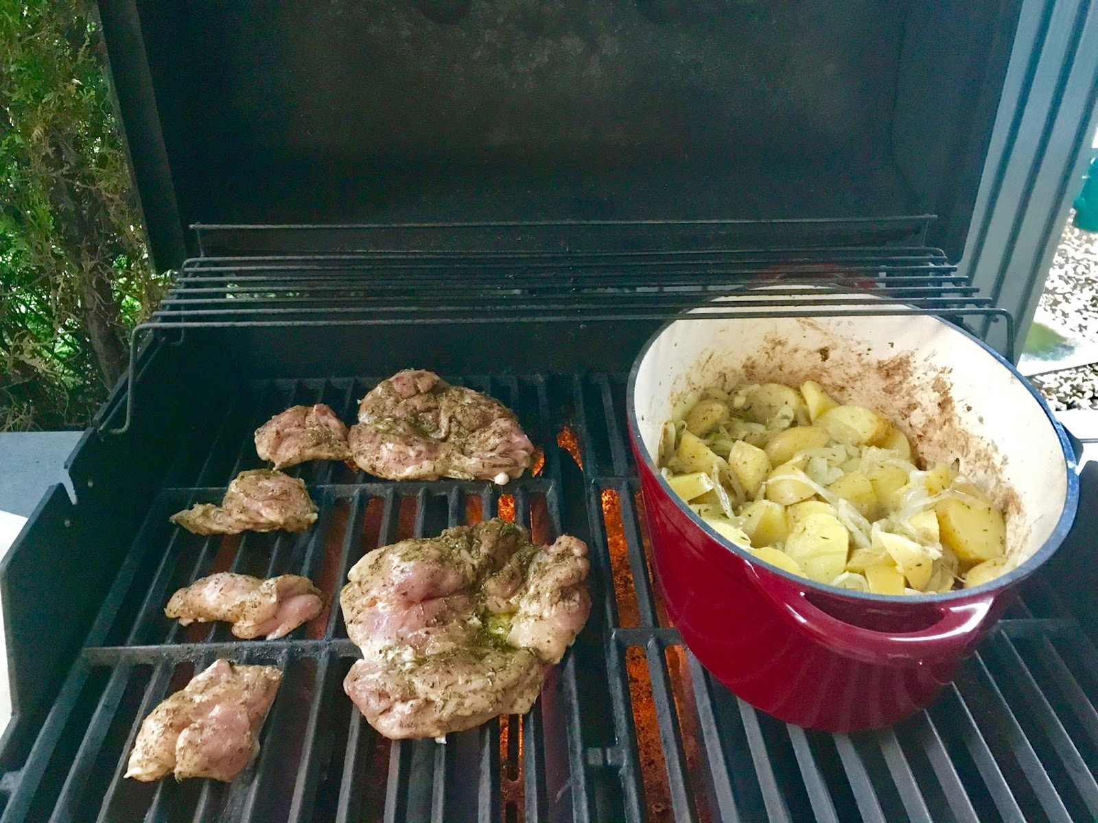 Die Schenkel auf die Kartoffel-Zwiebel-Mischung geben und alles bei zuem Grill ca. 10 Minuten köcheln lassen. Anschließend den Deckel öffnen, alles gut verrühren und weitere 10 Minuten einköcheln lassen.