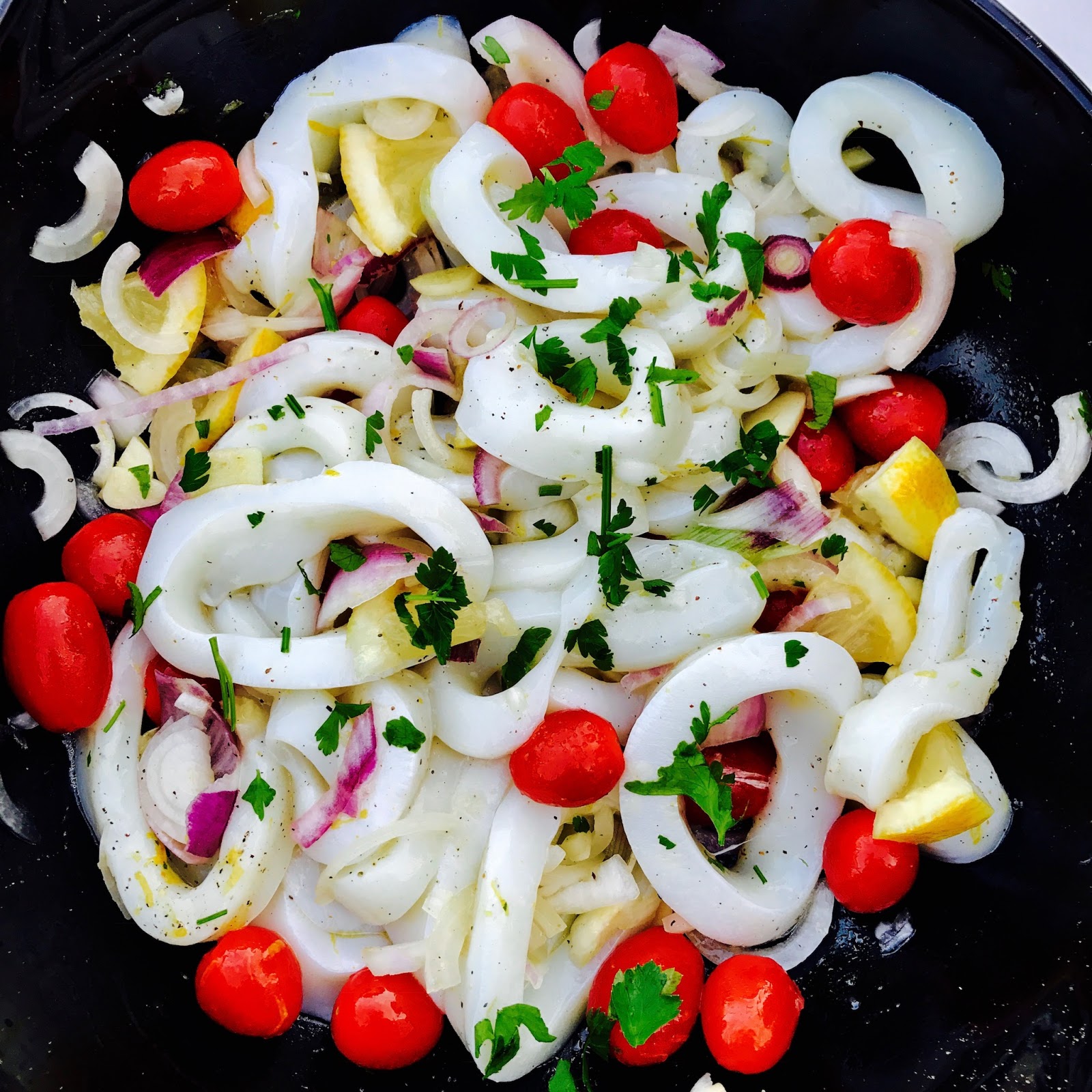 Die Tintenfischringe waschen und trocken tupfen. Mit dem Pfeffer, dem Salz und 2 EL Olivenöl in eine Schüssel geben. Die Zitrone in kleine Stücke schneiden, Knobi schälen, in feine Scheiben schneiden, Petersilie waschen und in feine Streifen schneiden (die Stiele ruhig mit verwenden, sie schmecken gut und sind knackig!), alles zu den Tintenfischringen geben und gut vermengen.