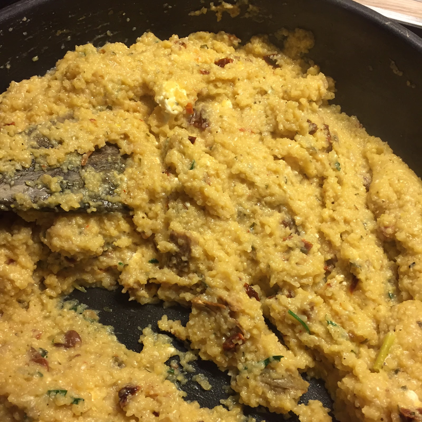 300 g Polenta, 1300 ml Gemüsebrühe und dann würzen, mit was immer ihr wollt! Ich habe hier verwendet: 12 sonnengetrockente Tomaten, in kleine Stücke geschnitten, 2 Knobizehen, 4 Schalotten, 1 Handvoll schwarze Oliven, 1/2 Paket Feta-Käse, 6 milde Peperoni, eine Handvoll Petersilie, außerdem Olivenöl, Toskanisches Pastagewürz, Luisenthaler Tiefensalz oder ein anderes gutes Küchensalz…