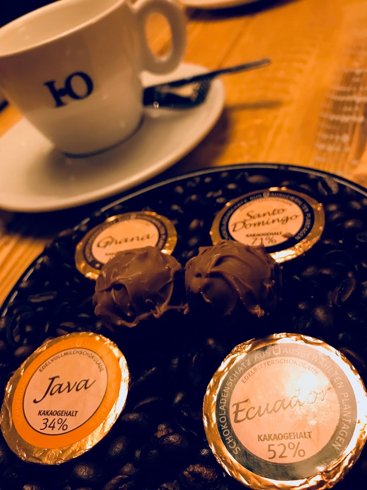 Zum Abschluß gönnen wir uns einen Espresso Macchiato und ganz hervorragende Schokolade.