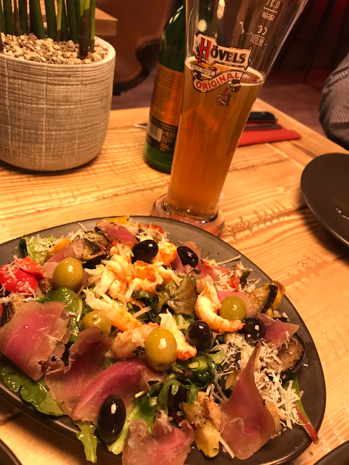 Wir testen den Filetshop zum ersten Mal Ende Januar. Und was soll ich sagen: Wir sind begeistert! Die kleine – aber ausreichend ausgestattete Karte wird ergänzt durch die „Tagestafel“. Selbst Vegetarier werden in diesem Fleischspezialitätengeschäft fündig. Wir wählen eine Vorspeisenplatte mit gebeiztem Filet, Flusskrebsen, Wildkräutersalat, gegrillter Antipasti und Oliven.