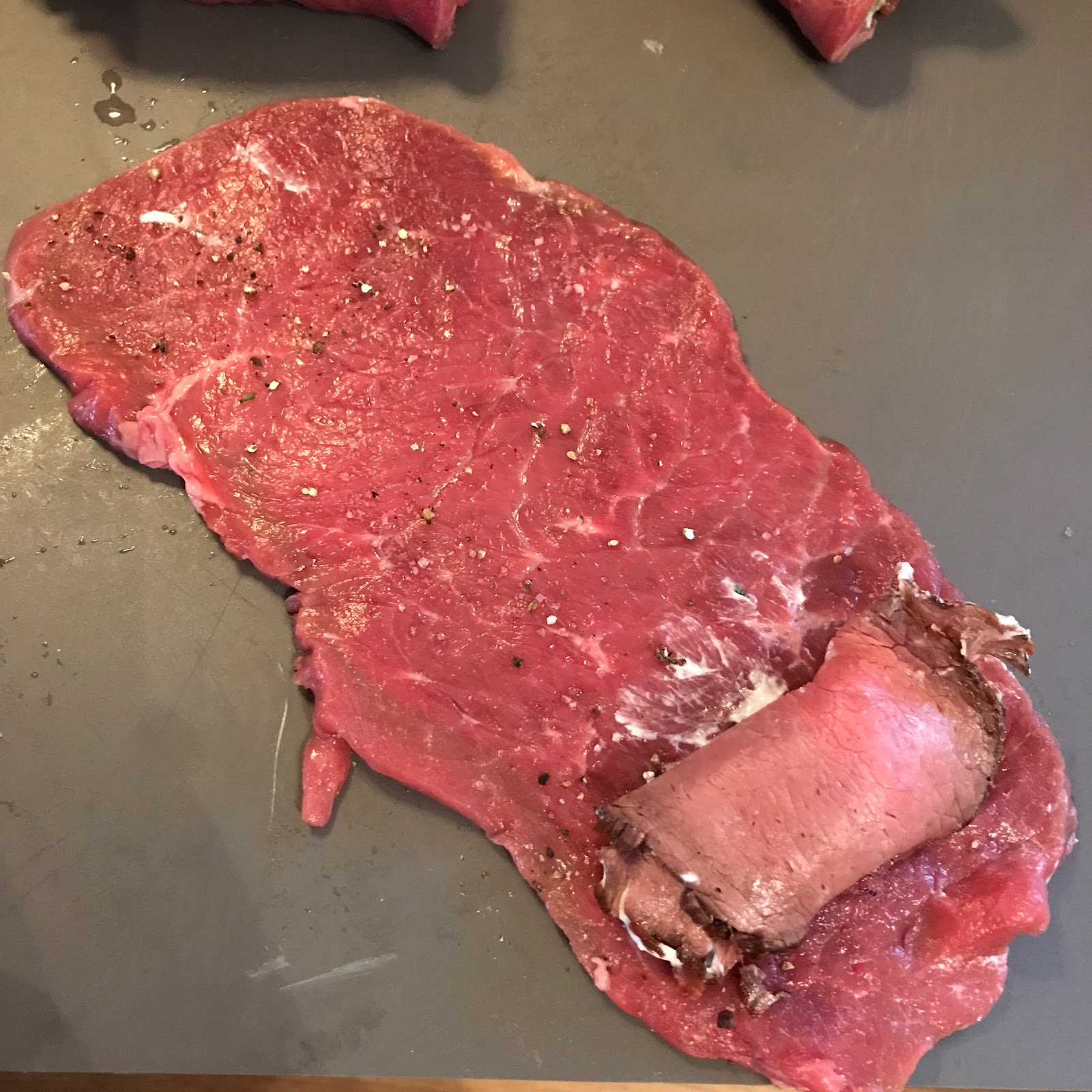 Einen Löffel der Füllung auf eine Scheibe Roastbeef legen und der Länge nach aufrollen. Die Rolle auf die untere (gffls. auf die breitere) Seite einer Kalbsfleischscheibe legen und das Kalbsfleisch von unten her aufrollen. Mit Zahnstochern oder Küchengarn verschließen.