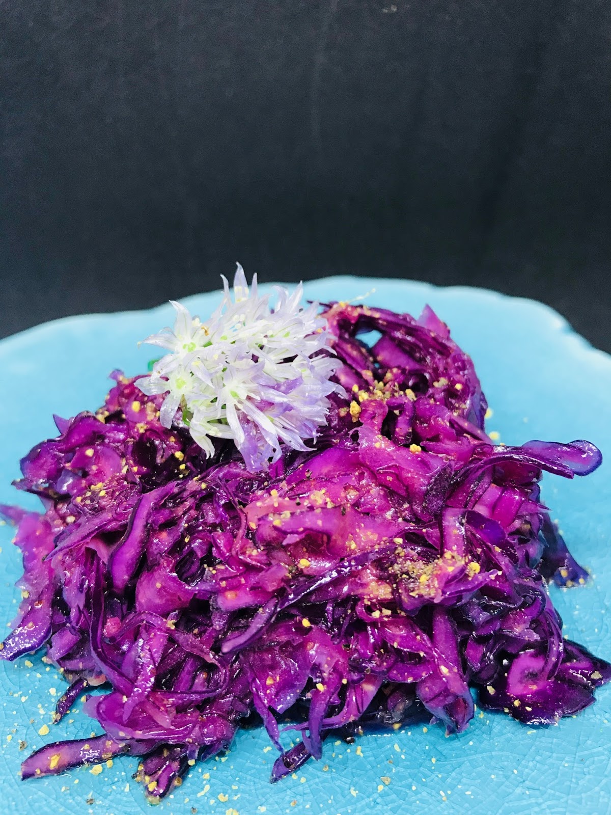 Am schönsten sieht der Rotkrautsalat auf einem anderes farbigen Teller aus. Wenn du dann noch eine essbare Blumen – wie die Ringelblume – im Garten auftreiben kannst, dann ist die Deko für dieses leichte, von Haus aus vegane Gericht fast perfekt. Oben drüber raspel ich noch ein bisschen Orangenschale von einer BIO-Orange. Das sieht toll aus und gibt dem Salat den letzten Schliff.