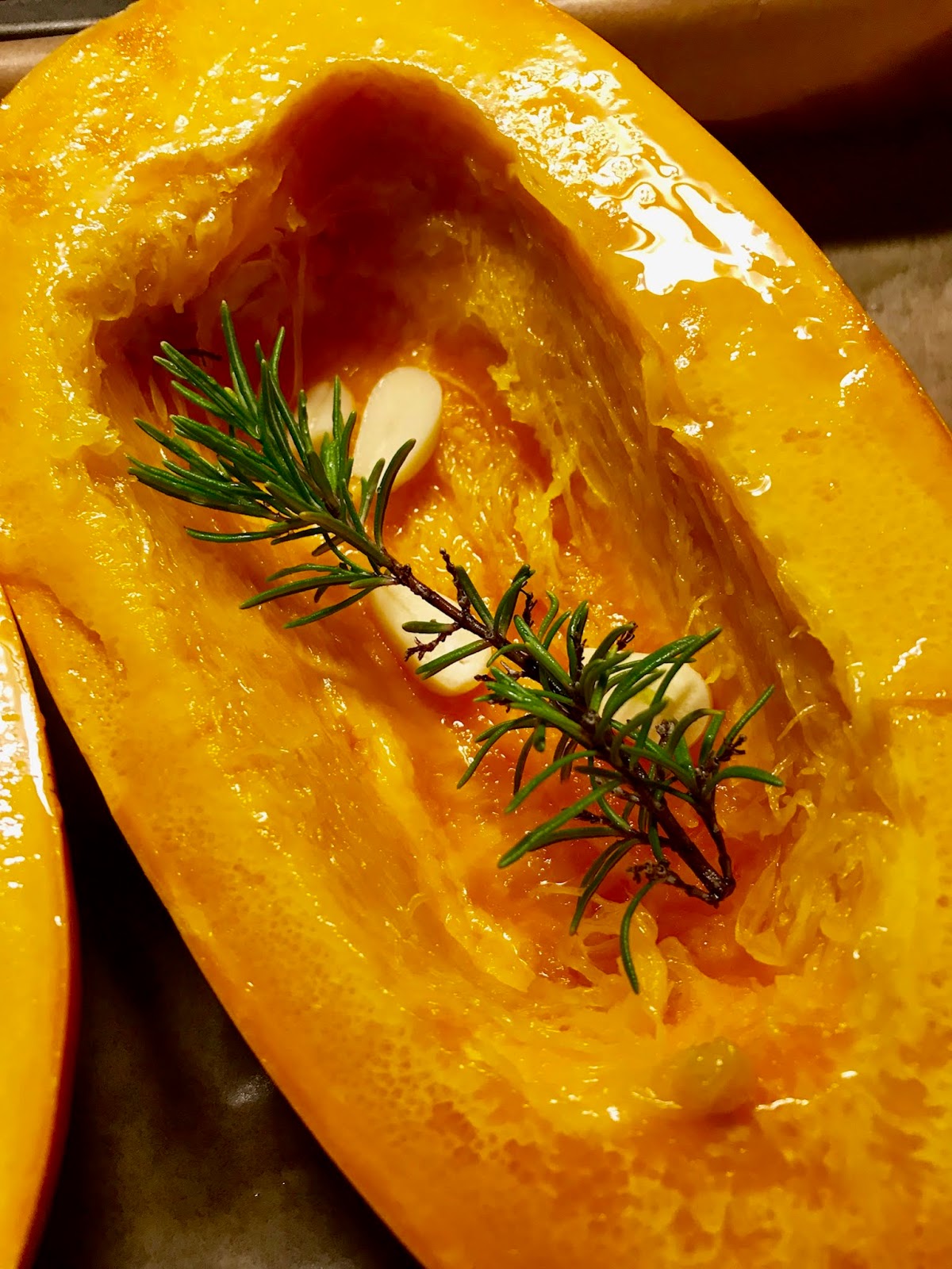 Am liebsten essen wir den Kürbis wie oben beschrieben, mit Butter, Salz und Parmesan.