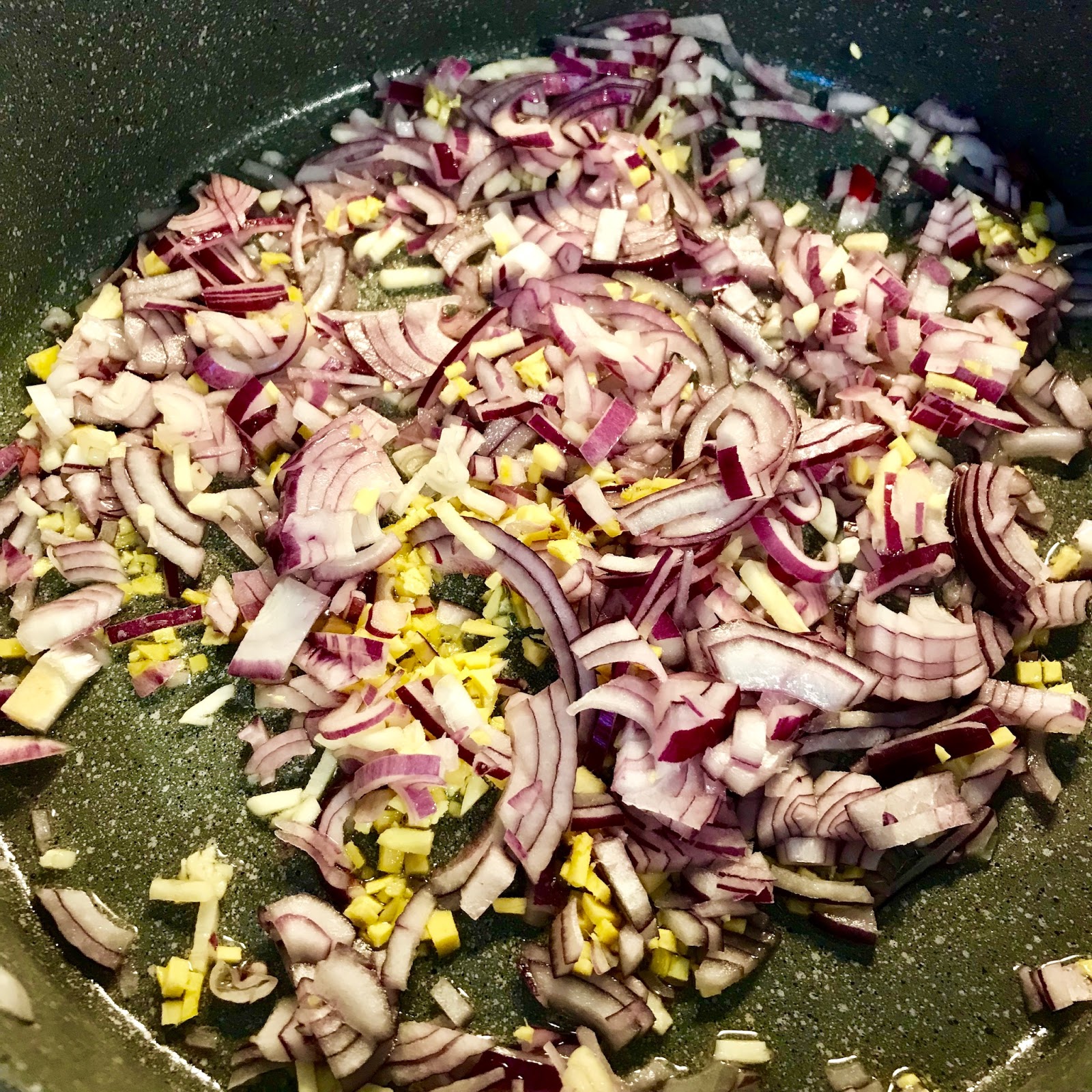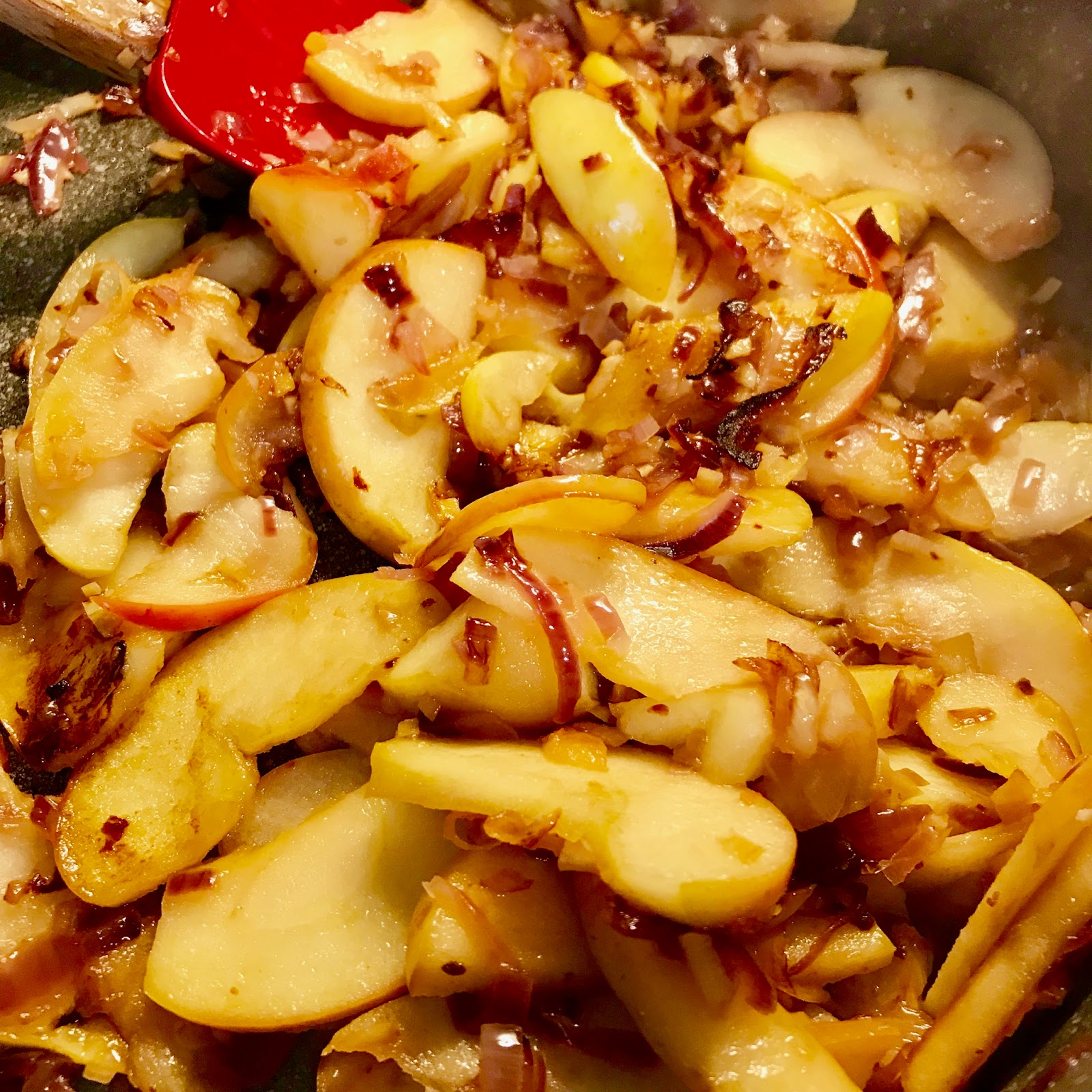 Ingwer, Knoblauch, Zwiebeln fein hacken, Äpfel in kleine Spalten schneiden und alles mit 2-3 EL neutralem Ol in einer Pfanne andünsten. 2 Prisen braunen Zucker, 2 Prisen Salz, 1 Prise Chiliflocken dazugeben und weiter schmoren, bis alles leicht braun geworden ist und Röstaromen angenommen hat. Zum kalt werden aus der Pfanne nehmen und beiseite stellen.