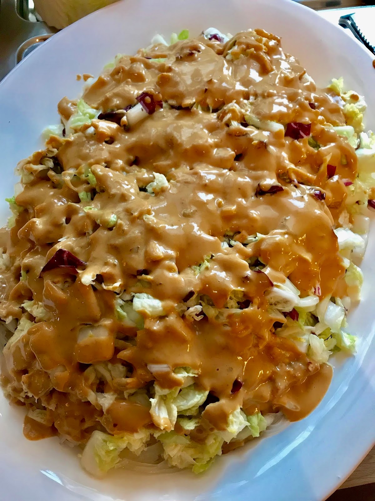 Erdnussbutter, Limettensaft, Chiliflocken, ein guter Schuss Sesamöl (ca. 2 EL), Sojasauce in einer Schüssel vermischen. Mit warmem Wasser ergänzen, bis sich eine leicht-flüssige Sauce ergibt (dabei immer wieder abschmecken und gegebenenfalls mitSojasauce, Limettensaft, Chili oder Sesamöl nachwürzen).