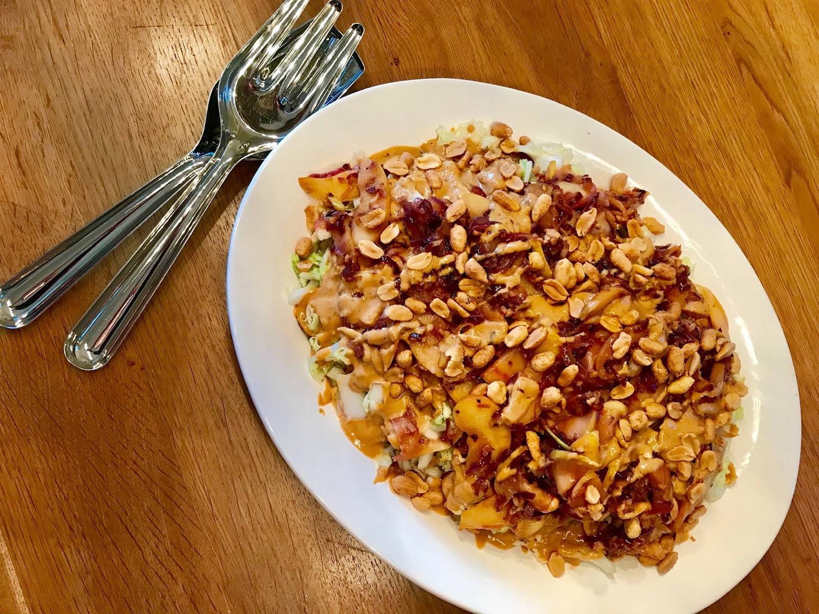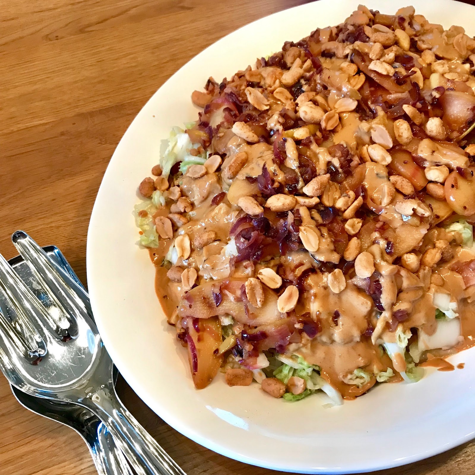 Darauf das Apfel-Zwiebel-Ingwergemisch geben und mit dem Rest der Sauce beträufeln. Den Salat mit gerösteten Erdnüssen bestreuen….