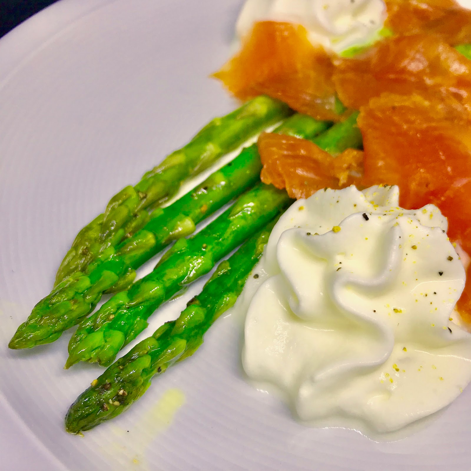 Karamelisierter grüner Spargel, Parmesanschaum, gebeizter Bachsaibling |