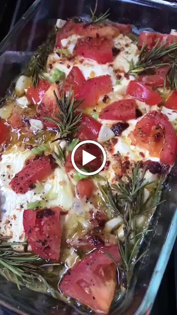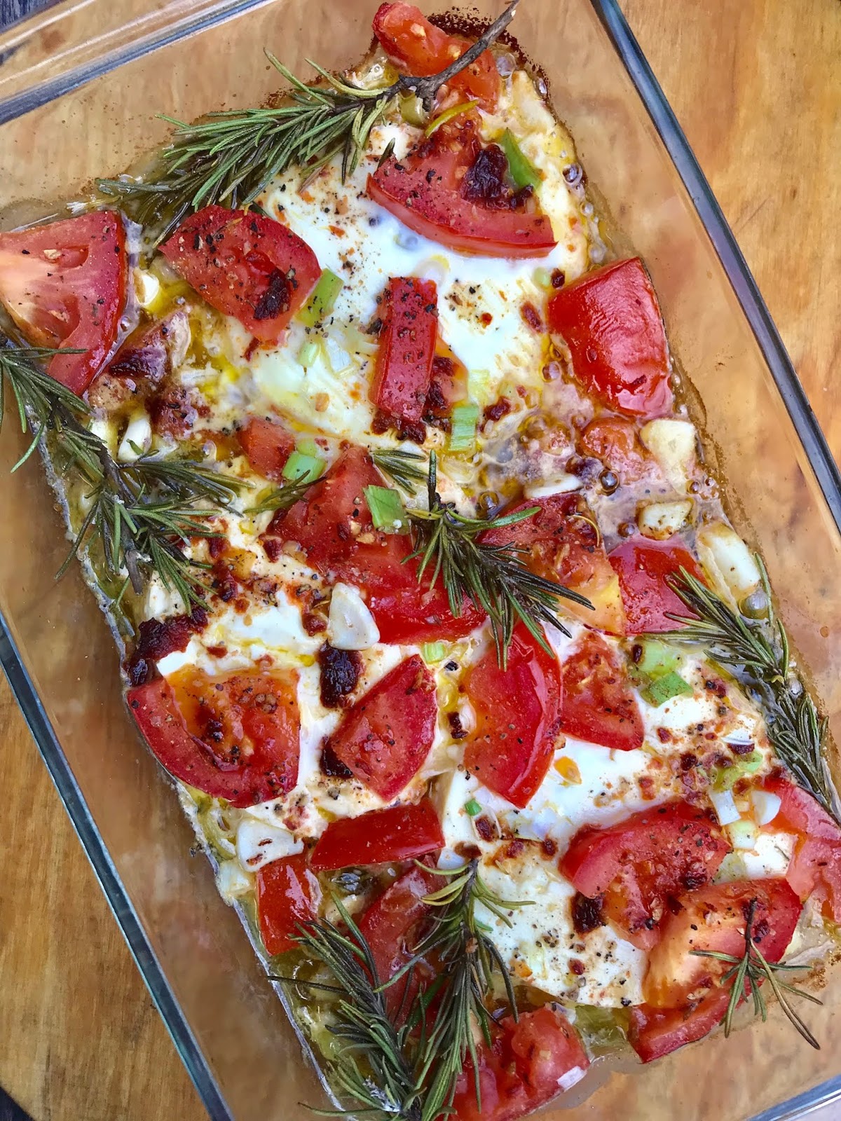 Die Auflaufform mit Olivenöl auskleiden. Den Feta in die Form geben, Tomaten, Lauchzwiebeln und Knobi klein schneiden und mit den Gewürzen und dem Rosmarin über den Feta geben.
