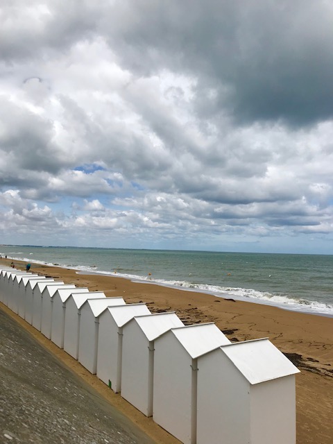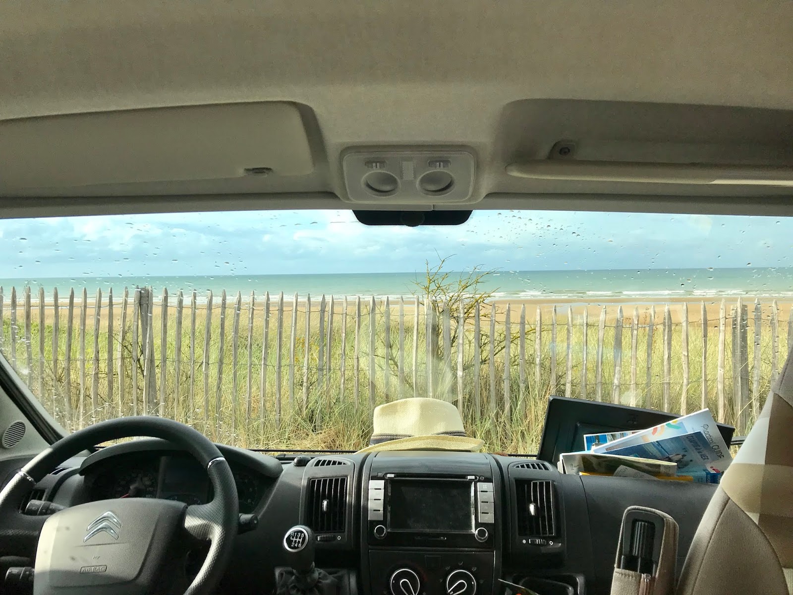 Wir landen in Merville-Franceville-Plage und ergattern einen Wohnmobilstellplatz direkt oben auf der Düne mit schönem Blick über den weitläufigen Strand und das tosende Meer.