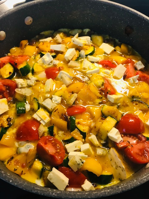 Die Eier mit einer Gabel ordentlich verquirlen und viel Luft drunter rühren, ein wenig Mineralwasser und Salz drangeben , Tomaten und Feta klein schneiden. Das Ei über das Gemüse in die Pfanne geben, Feta und Tomatenwürfel rein, die Hitze runter drehen und den Deckel auf die Pfanne legen.