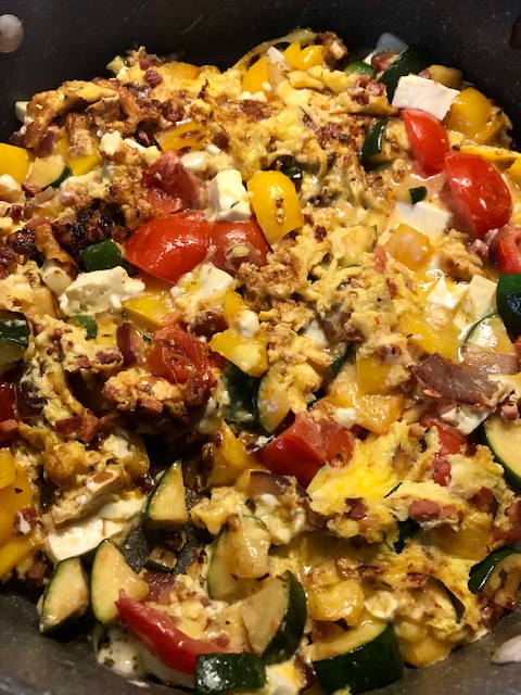 Nachdem die Masse gestockt ist, alles eventuell umdrehen (so mag es mein Mann) oder ein wenig mit dem Pfannenwender auseinander zupfen (so mag ich es) und warm servieren….