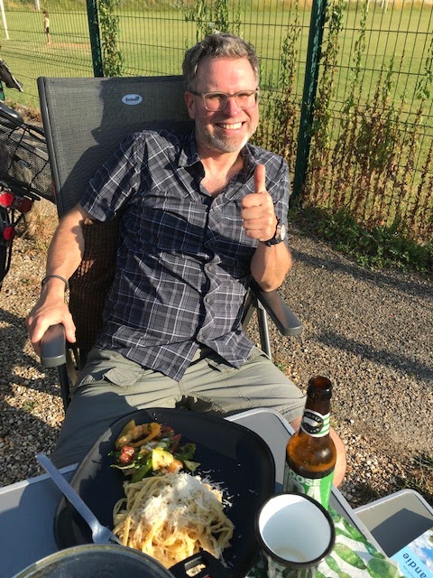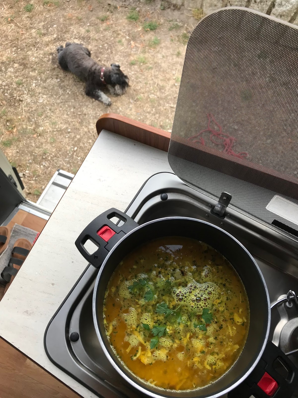 Beseelt beenden wir langsam den Tag und chillen am Wohnmobil, genießen ein hervorragendes Safranrisotto und genießen die Ruhe in der Natur am seichten Flußufer….