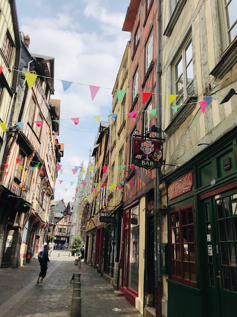 Sonntag, 21.7.19 Von Montville aus fährt in nur 11 Minuten ein Zug nach Rouen. Vom Stellplatz ist der Bahnhof zu Fuß in 10 Minuten zu erreichen. Da wir jedoch am selben Tag noch weiterfahren möchten, beschließen wir mit dem Wohnmobil in die Stadt zu fahren und steuern einen der zwei stadtnahen Stellplätze an. Ein schrecklicher Ort und als Stellplatz wirklich nicht geeignet! Scherben, Müll und Unrat – dazu verkommene Campingbusse mit lausig aussehenden Bewohnern, ich habe schon Angst, das Wohni mit all‘ unseren Habseligkeiten hier stehen zu lassen, aber wir riskieren es und machen uns zu Fuß in die sehenswerte Stadt die uns mit der imposanten Kathedrale und den altertümlichen Gebäuden in ihren Bann zieht…