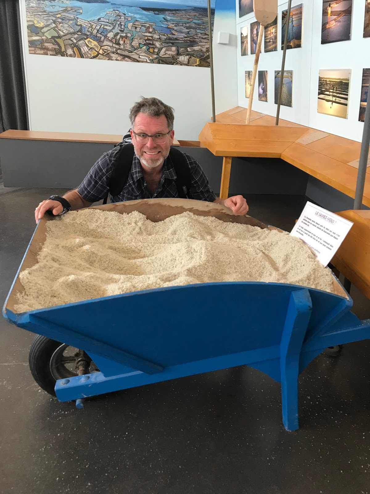 Dienstag, 23.7.19, Mit dem Auto fahren wir vom Camping-Platz aus zu Terre de Sel. (Mit dem Fahrrad ist das unserer Meinung zu lang und der Weg oft zu gefährlich, leider ist nicht überall ein Radweg und die Straßen sind manchmal eng und unübersichtlich). Dies ist die offizielle Vereinigung der Paludiers – der Salzbauern in der Bretagne. Neben umfangreichen Informationen und natürlich einem Shop rund um die Salzprodukte werden hier auch Führungen durch die Salzfelder angeboten.