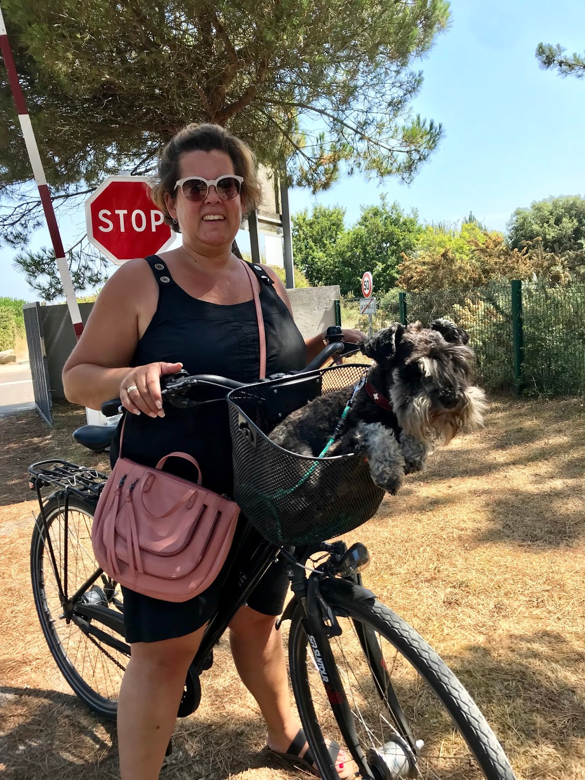 Mittwoch, 24.7.19, La Turballe. Mit dem Fahrrad fahren wir die angenehmen 2-3 km vom Campingplatz in die Stadt (Fahrradweg vorhanden). Sancho begreift endlich – nach 5 Jahren – das Fahrradfahren toll sein kann und läßt sich mit der Nase hoch in der Luft den Wind ums Köpfchen wehen! Gott sei Dank! Wäre er nicht in den Korb gegangen, hätten wir den Ausflug mit ihm vergessen können. Es ist schlicht zu heiß um ihn so eine Strecke laufen zu lassen!