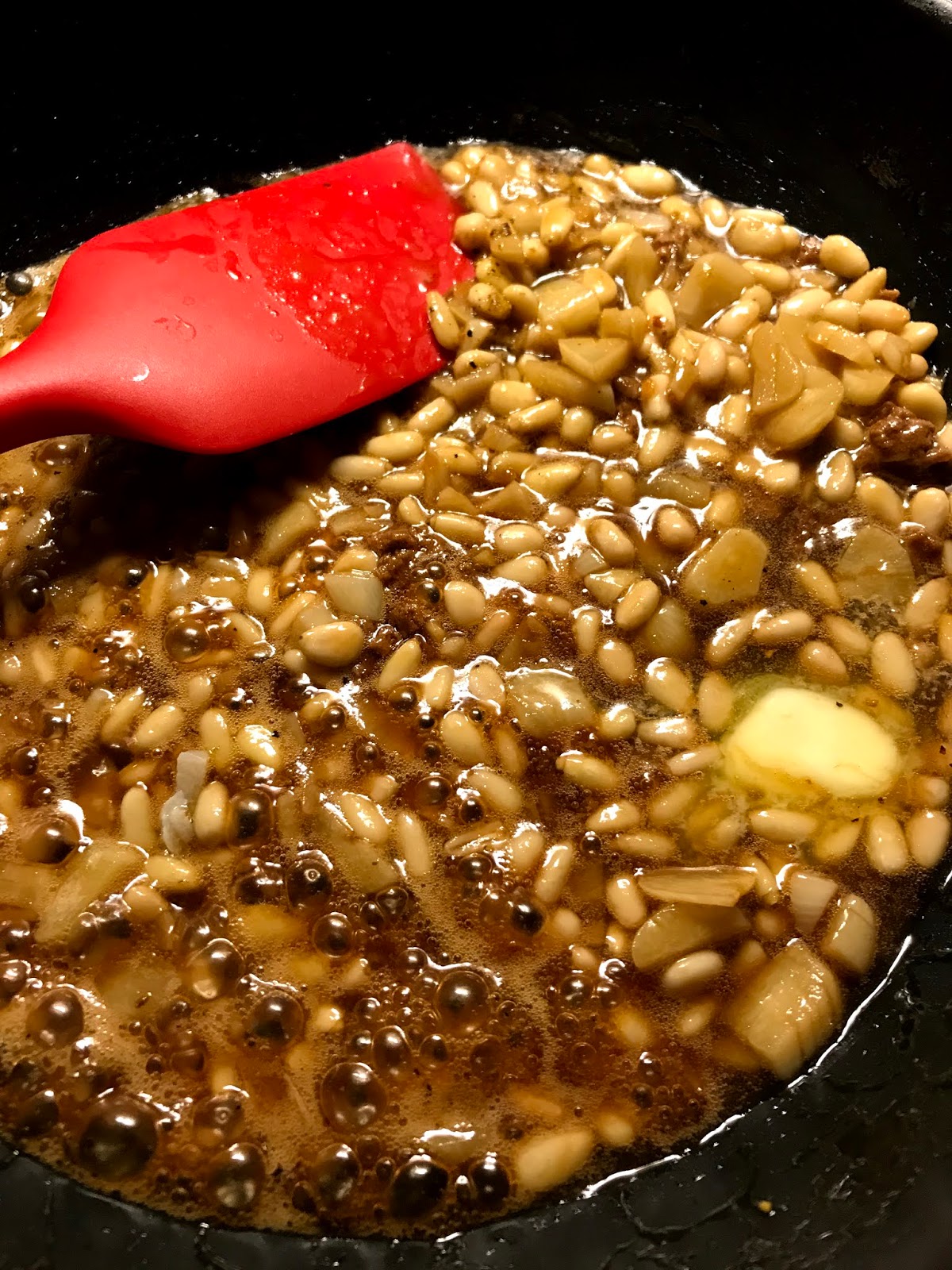 Zucker in einer Pfanne goldgelb schmelzen. 2 EL Butter und Essig einrühren. Pinienkerne und Knoblauch untermischen und bei mittlerer Hitze unter Rühren karamellisieren lassen. Mit Salz und Pfeffer würzen.